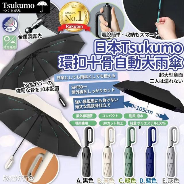 📢團購(現貨)---F025✨日本 Tsukumo 環扣檔風十骨自動大雨傘✨$58