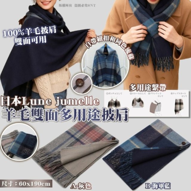 📢預訂團購---K042✨日本Lunejumelle|羊毛雙面多用途披肩60x190cm✨(約1月尾到貨)-$139
