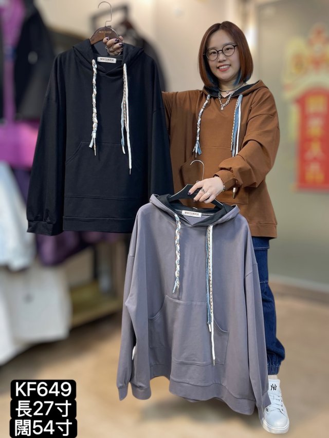KF649 棉料叮噹袋織紋繩有帽TOP 長27寸、闊54寸 $159 黑、啡、灰