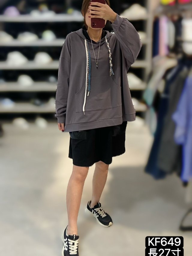 KF649 棉料叮噹袋織紋繩有帽TOP 長27寸、闊54寸 $159 黑、啡、灰