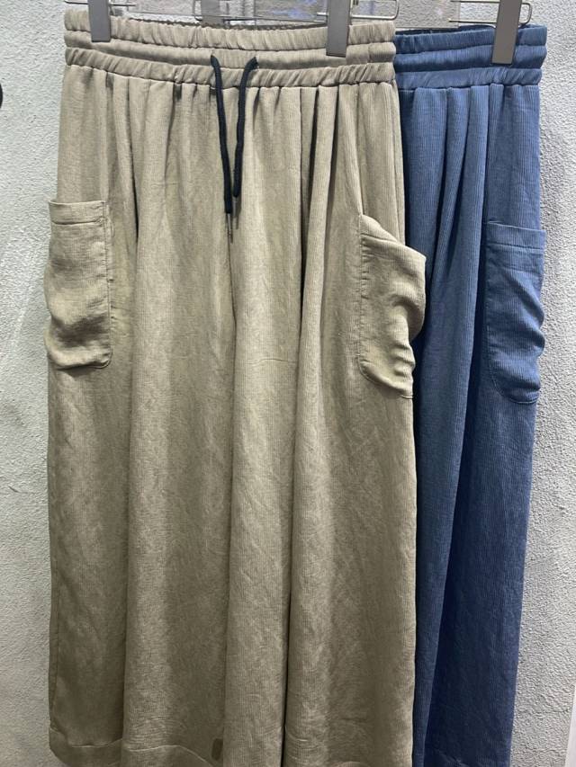 KF578 全橡筋直紋雙袋闊褲 $130 藍、杏