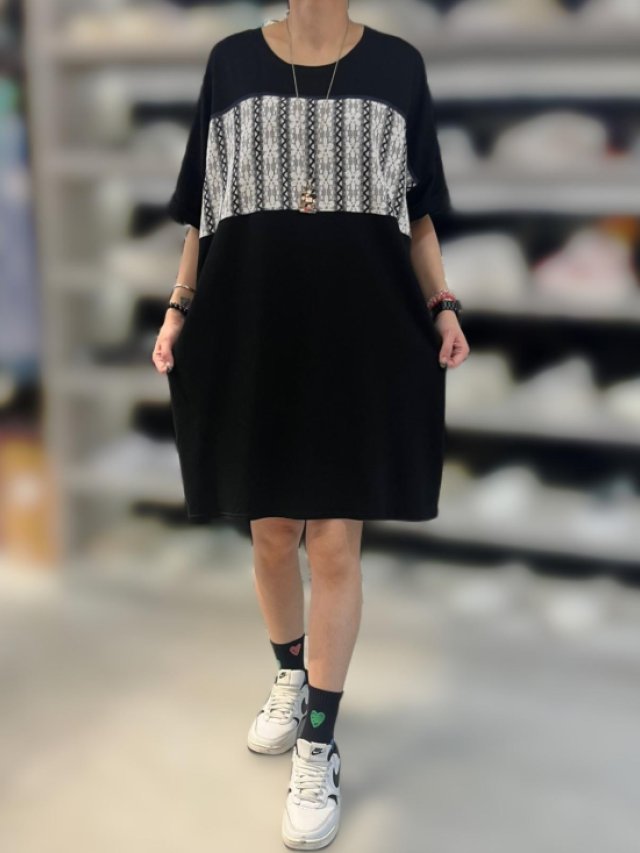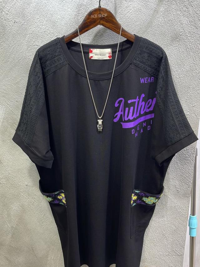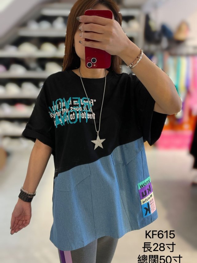 KF615 棉料拼牛仔字母Top $110 黑、藍 📌長28寸、總闊50寸