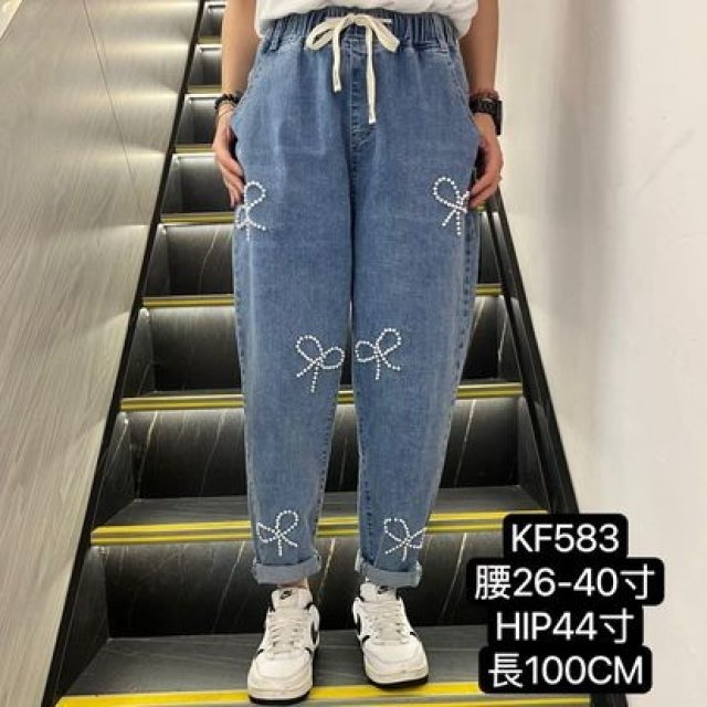 KF583 全橡筋腰珍珠蝴蝶結牛仔褲 $140 -腰26-40寸、Hip44、長100cm