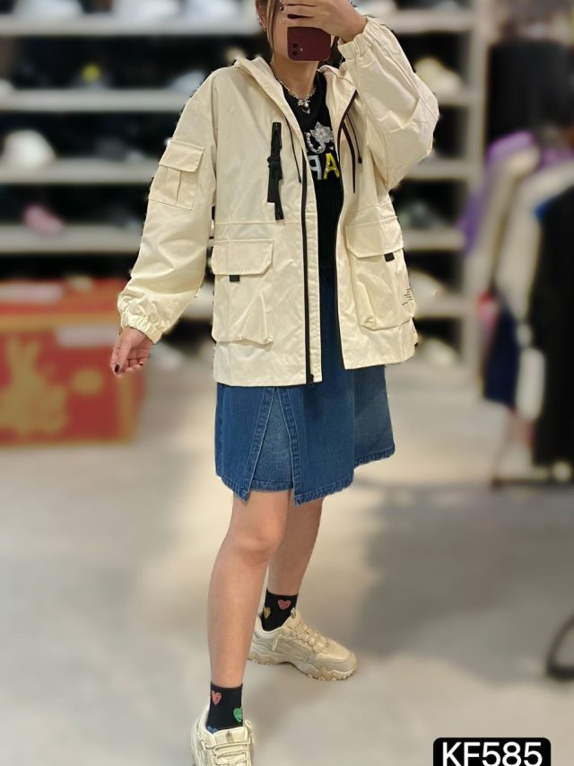 KF595 束腰風褸拼牛仔有帽外套 長27寸、胸闊44寸、腳闊46寸 $199 米、杏、黑