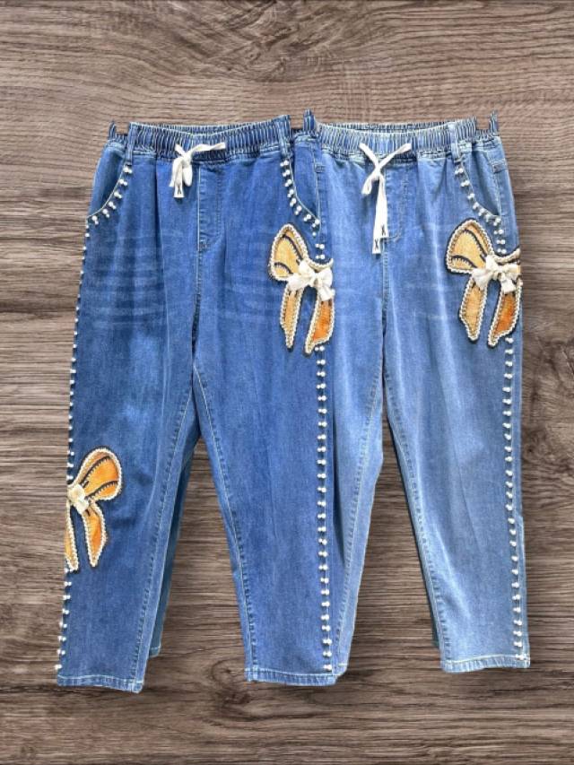 KF580 全橡筋腰豹紋蝴蝶結釘珠牛仔褲 腰26-40寸 Hip40-48寸 長92CM 淺藍、深藍 $189
