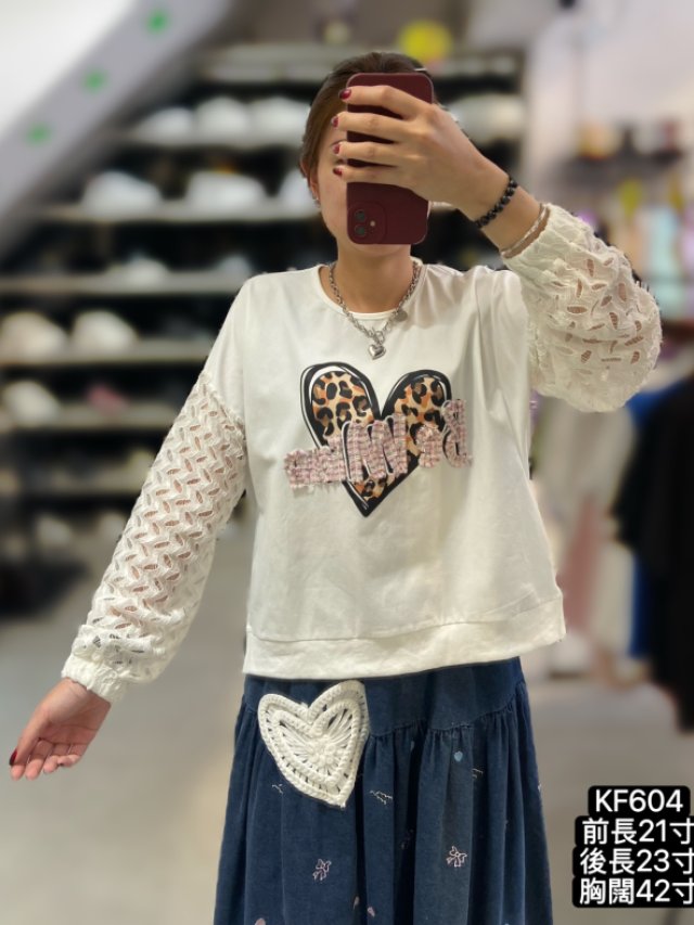 KF604 豹紋心心拼冷線字長袖通花開叉TOP 前長21寸、後長23寸 闊42寸 $149 黑、白