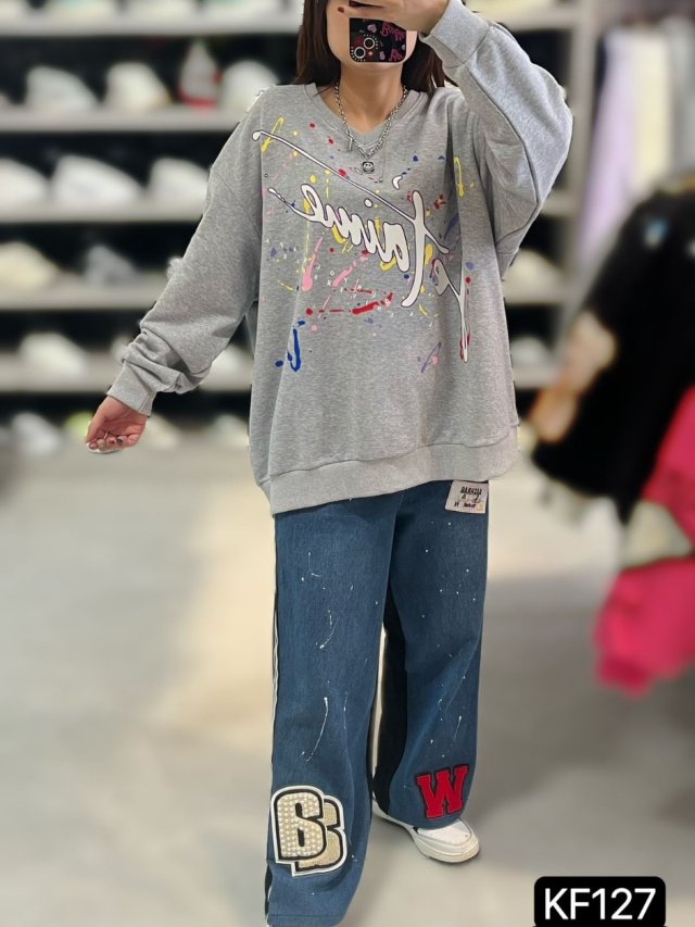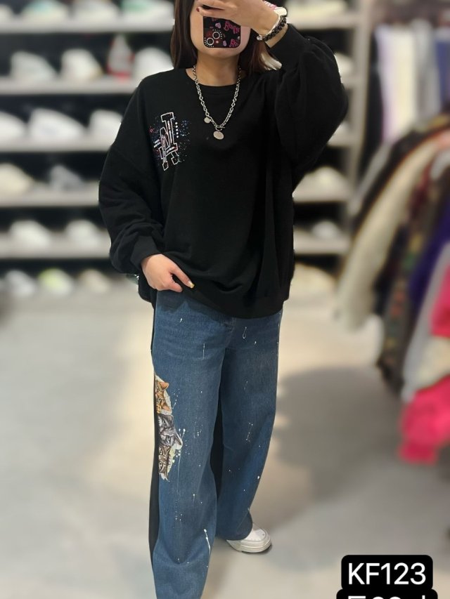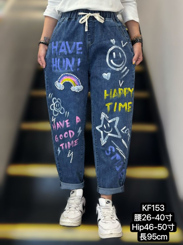 KF153 手繪塗鴉彩虹拼珍珠牛仔褲 $199