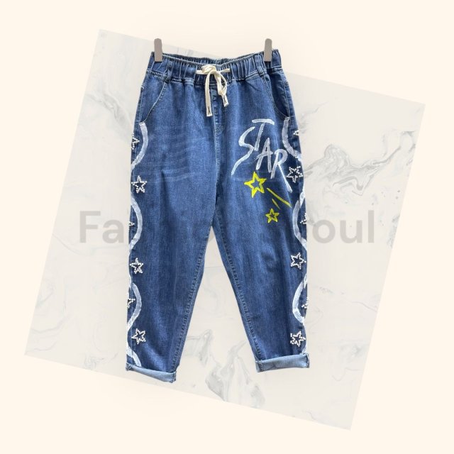 KF30 全橡筋腰手繪珍珠星星牛仔褲 $199 腰28-44寸、Hip44-54寸、長94cm