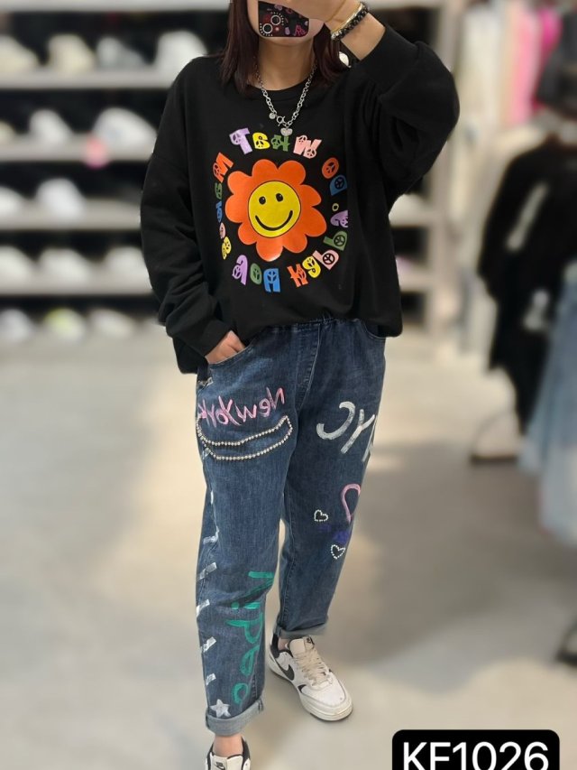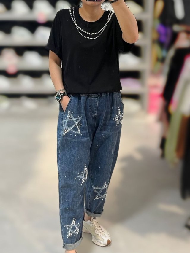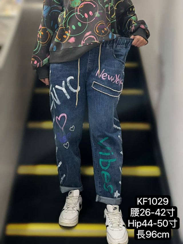 KF1029 手繪英文拼珍珠牛仔褲 $190