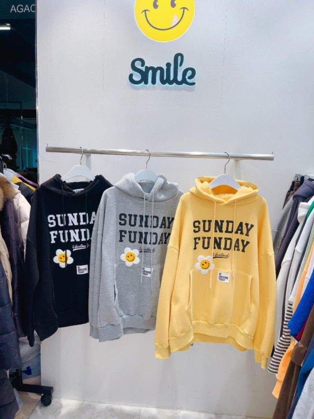 AA111 韓國 🇰🇷 印字哈哈笑太陽花薄毛底有帽Top $219 黑、灰、黃 長27寸、總闊52寸