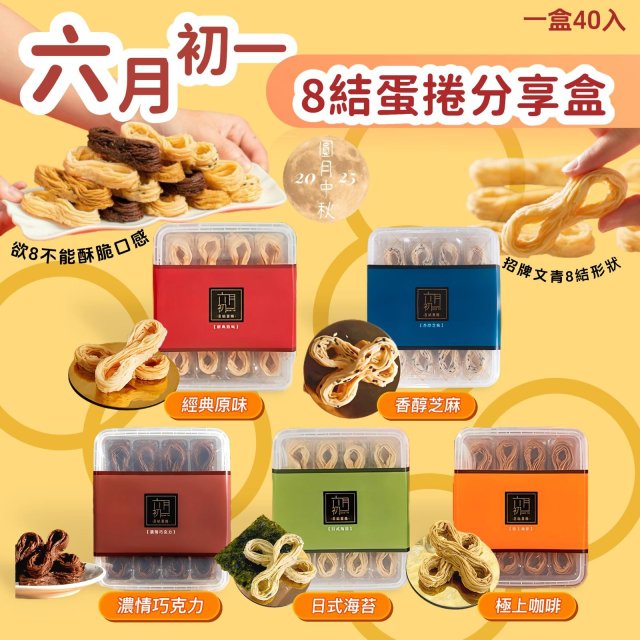 FD1578 六月初一經典8結蛋捲分享盒40入 $109@1,3盒或以上每盒-$9 經典原味/香醇芝麻/極上咖啡/日式海苔/濃情功克力