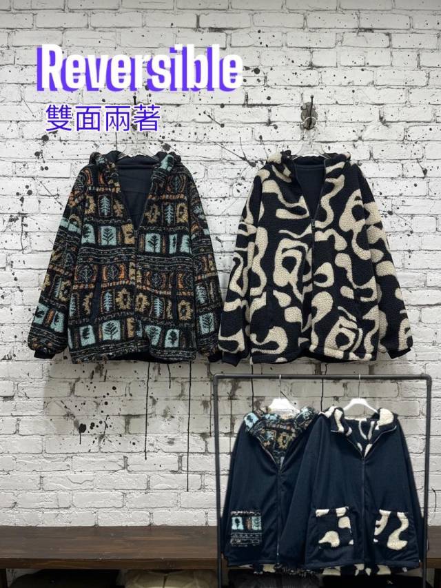 KF806 滿版圖案羊羔毛有帽雙面褸 長29寸、闊52寸 $299 黑杏、黑彩