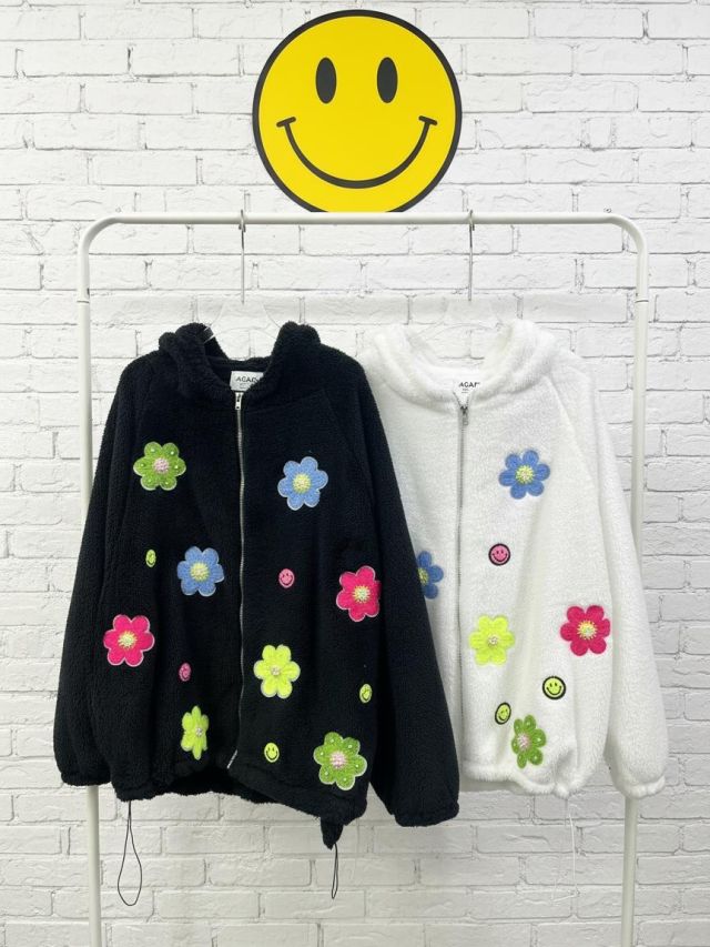 KF830 立體花花刺繡哈哈笑有帽毛毛褸 長27吋、闊56吋、 黑、白 $199