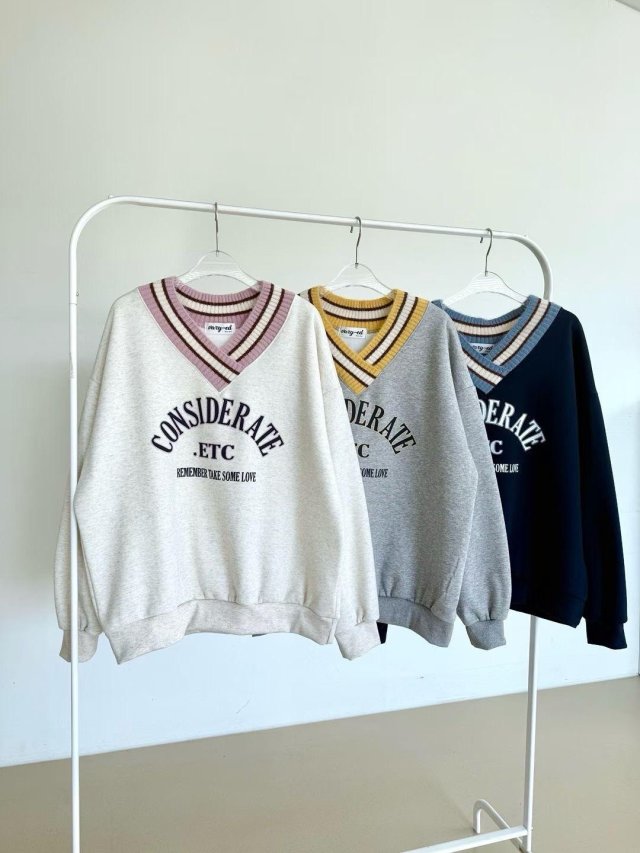 KF840 冷拼色V領印字毛底TOP 藍、深灰、淺灰 長26寸、闊50寸 $159