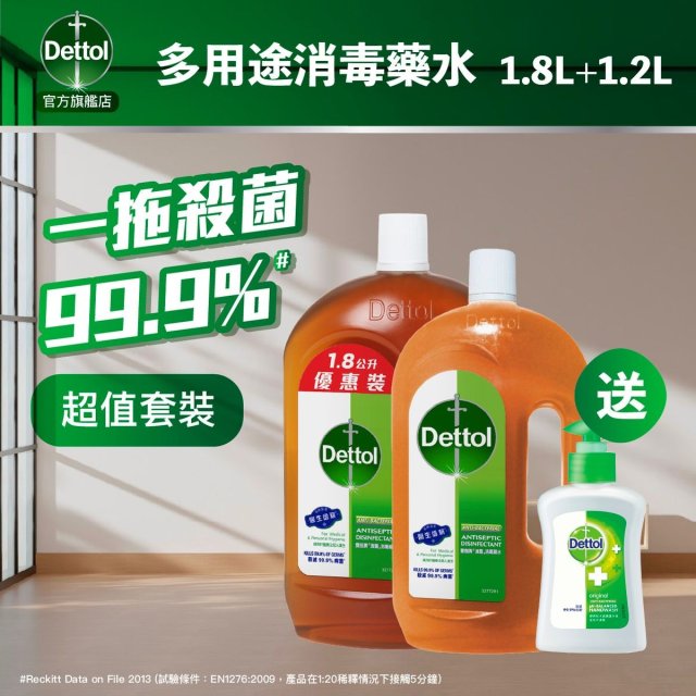 LG843 Dettol 滴露 -消毒藥水 1.2升+1.8升,再送殺菌洗手液 250g*1支, (LG843+LG844優惠套裝 $225@1套)