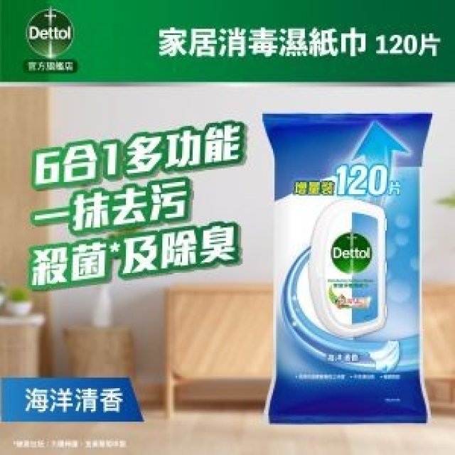 LG844 Dettol 滴露 -家居消毒濕紙巾120片$70@1 海洋清香/檸檬香味, (LG843+LG844優惠套裝 $225@1套)