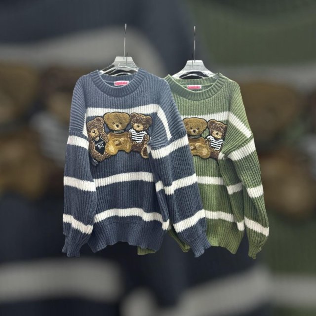 KF71 三隻立體熊仔拼色橫間冷衫 $129 啡、白、灰、綠