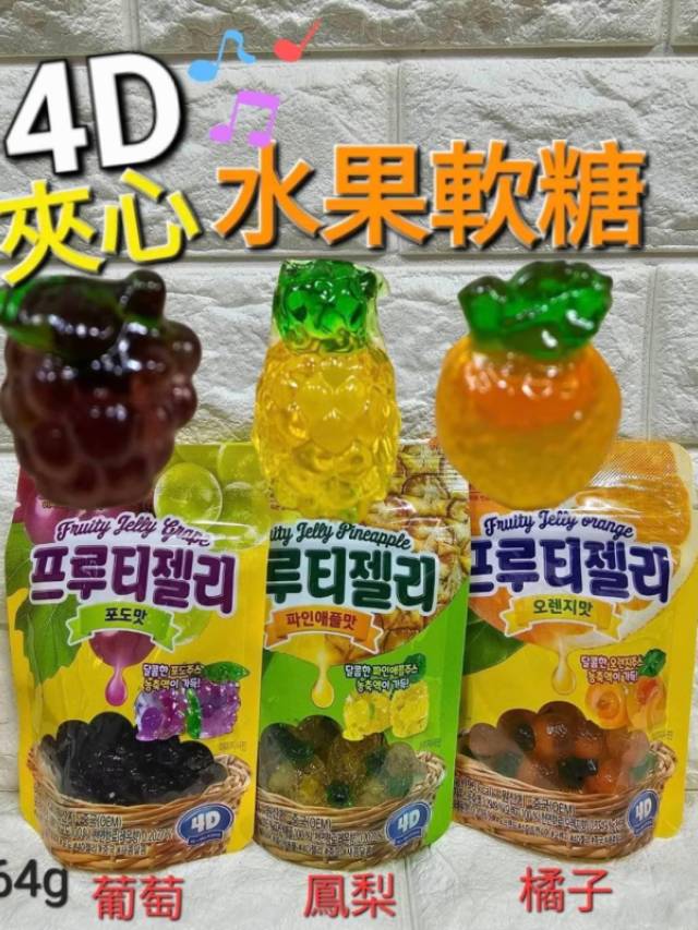 FD42 4D夾心水果軟糖64g $15@1,3包或以上$13@1 提子、菠蘿、桔