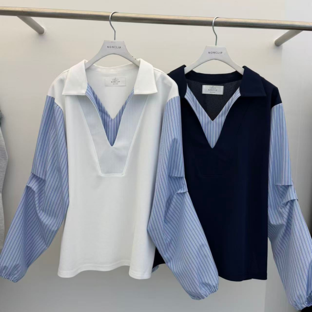 NP37 韓國 🇰🇷 V領拼條子假兩件Top $209 白、藍 長24寸、總闊44寸