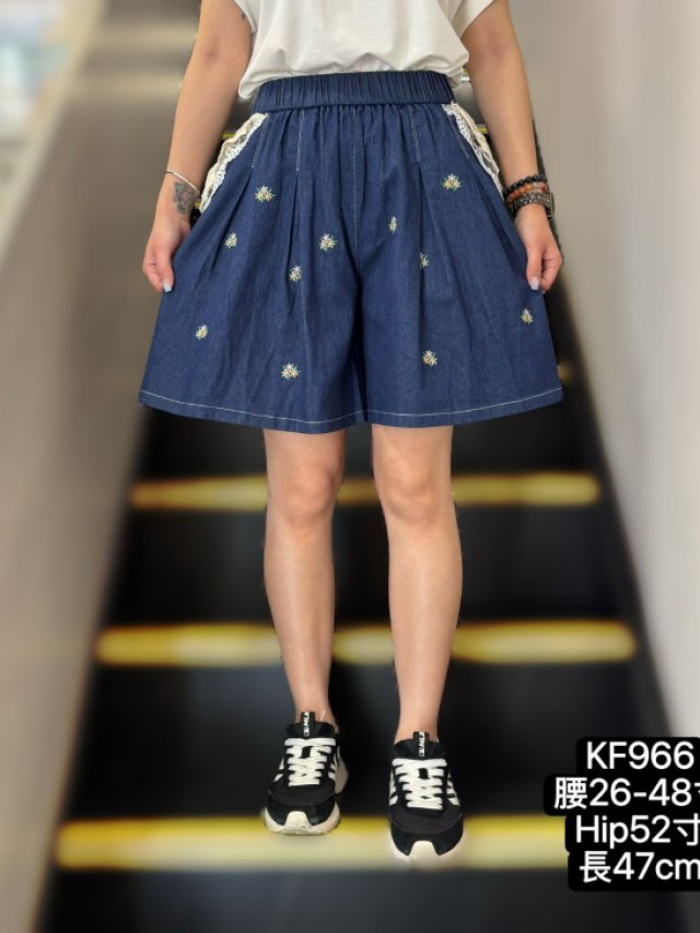 KF996 全橡筋腰LACE勾花袋刺繡花牛仔短褲 $159 腰26-48寸、Hip52寸、長47cm