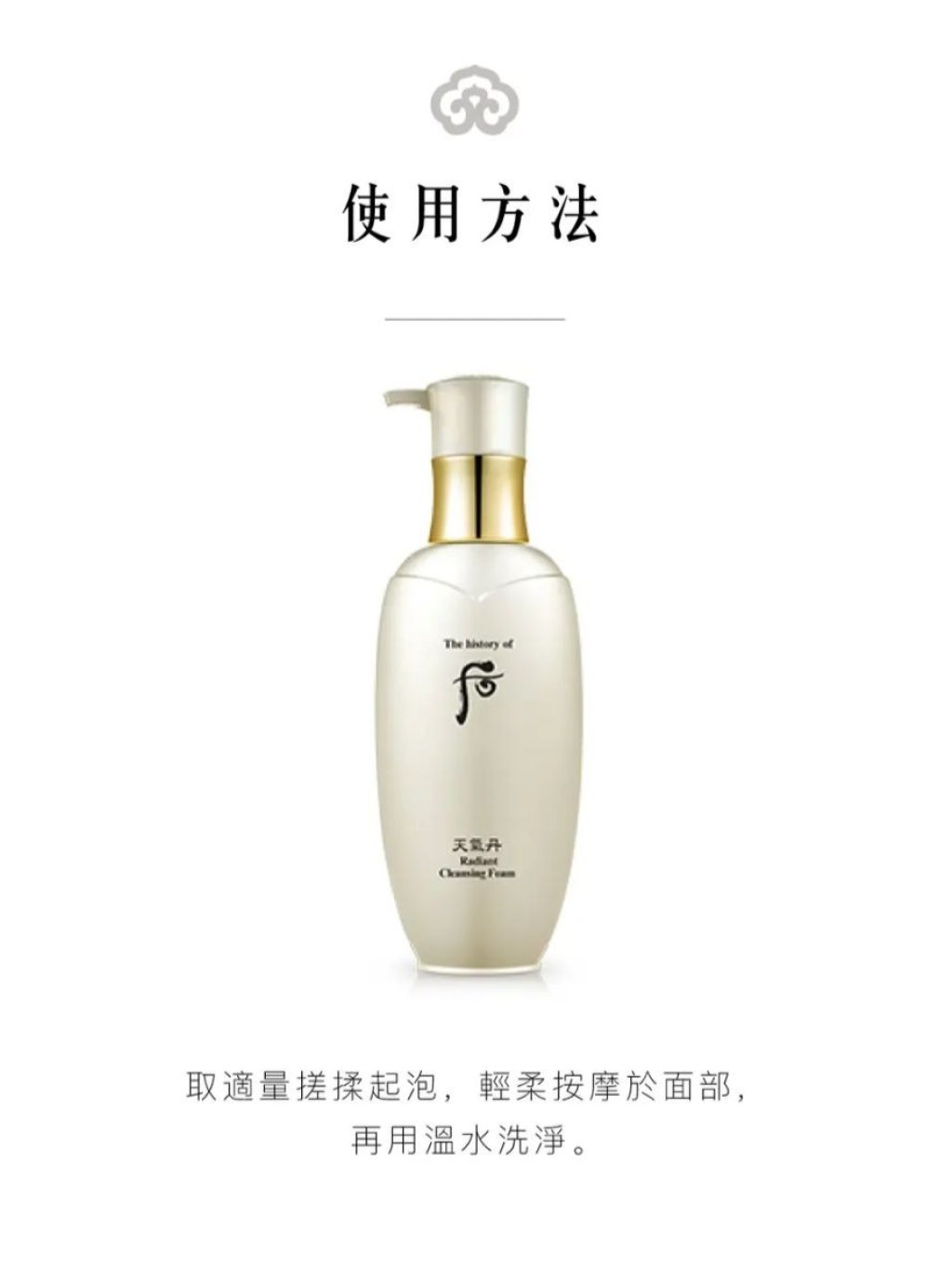 取兩泵份量於掌心,加入適量清水打圈至起泡後,輕輕推勻到面部和頸部,避開眼睛,按摩1-2 分鐘後,最後以溫水徹底洗凈。