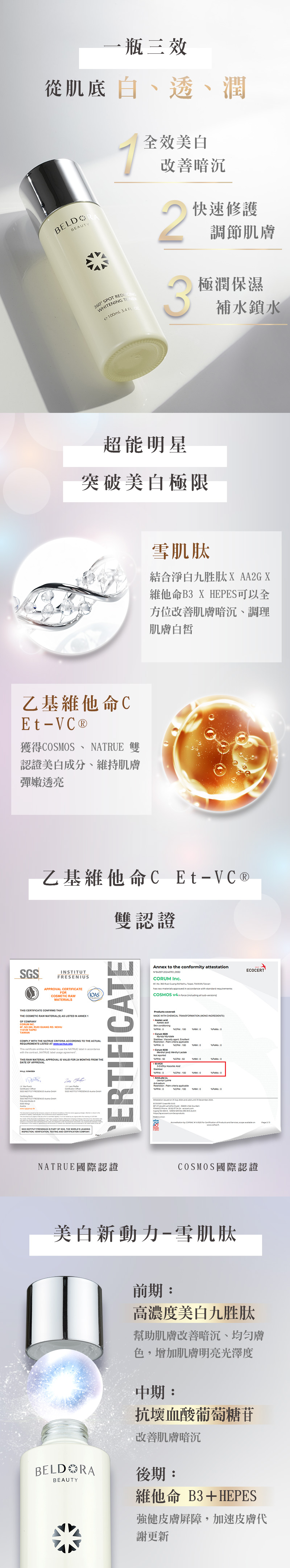 1.乙基維他命C Et-VC雙認證-衛福部核可美白成分,獲得(NATRUE國際認證+COSMOS國際認證),淡化斑點暗沉同時維持肌膚彈嫩透亮。