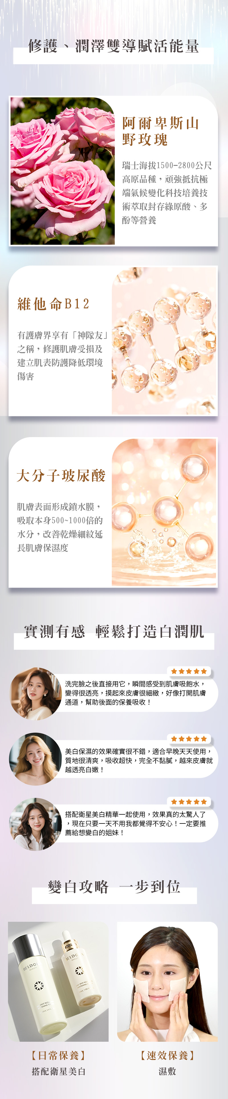 全效美白x快速修護x極潤保濕 全方位保養功效,使用後像是直接打開肌膚美白的通道,幫助後面的保養效果更好!讓你從肌底白、透、潤!