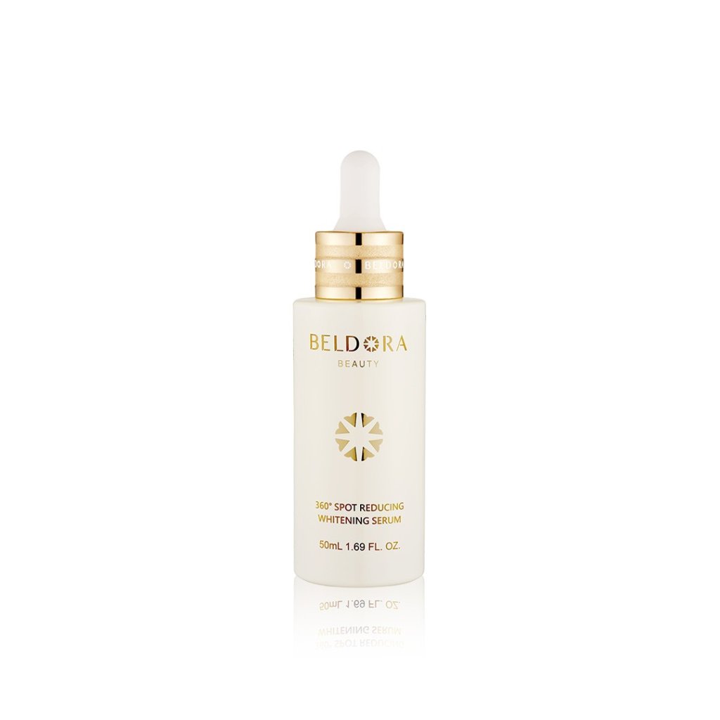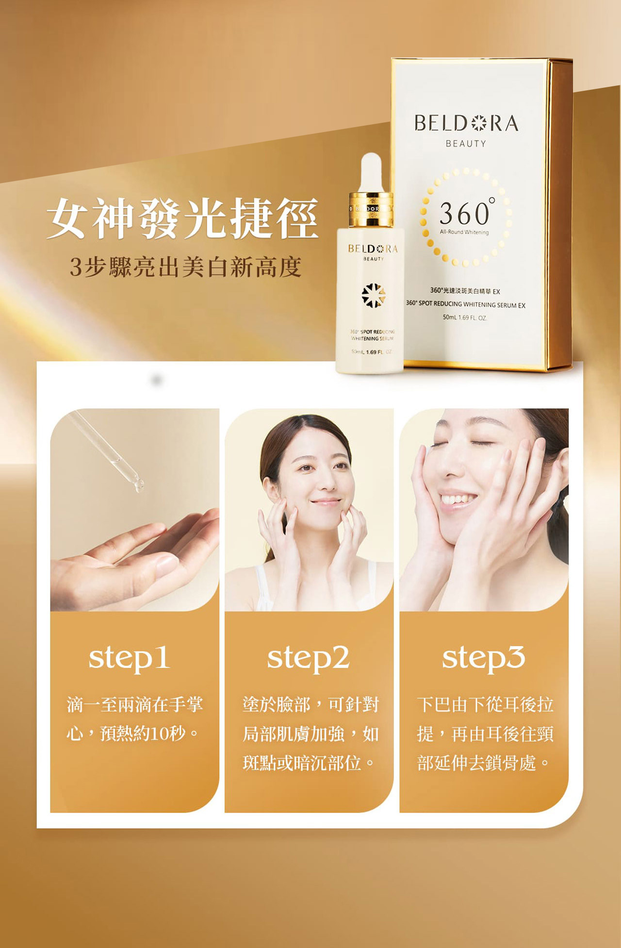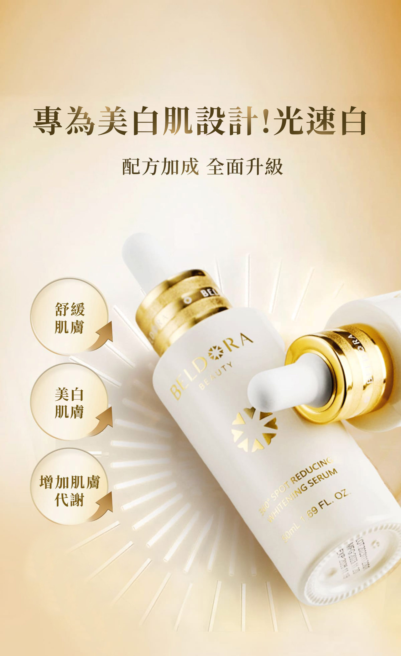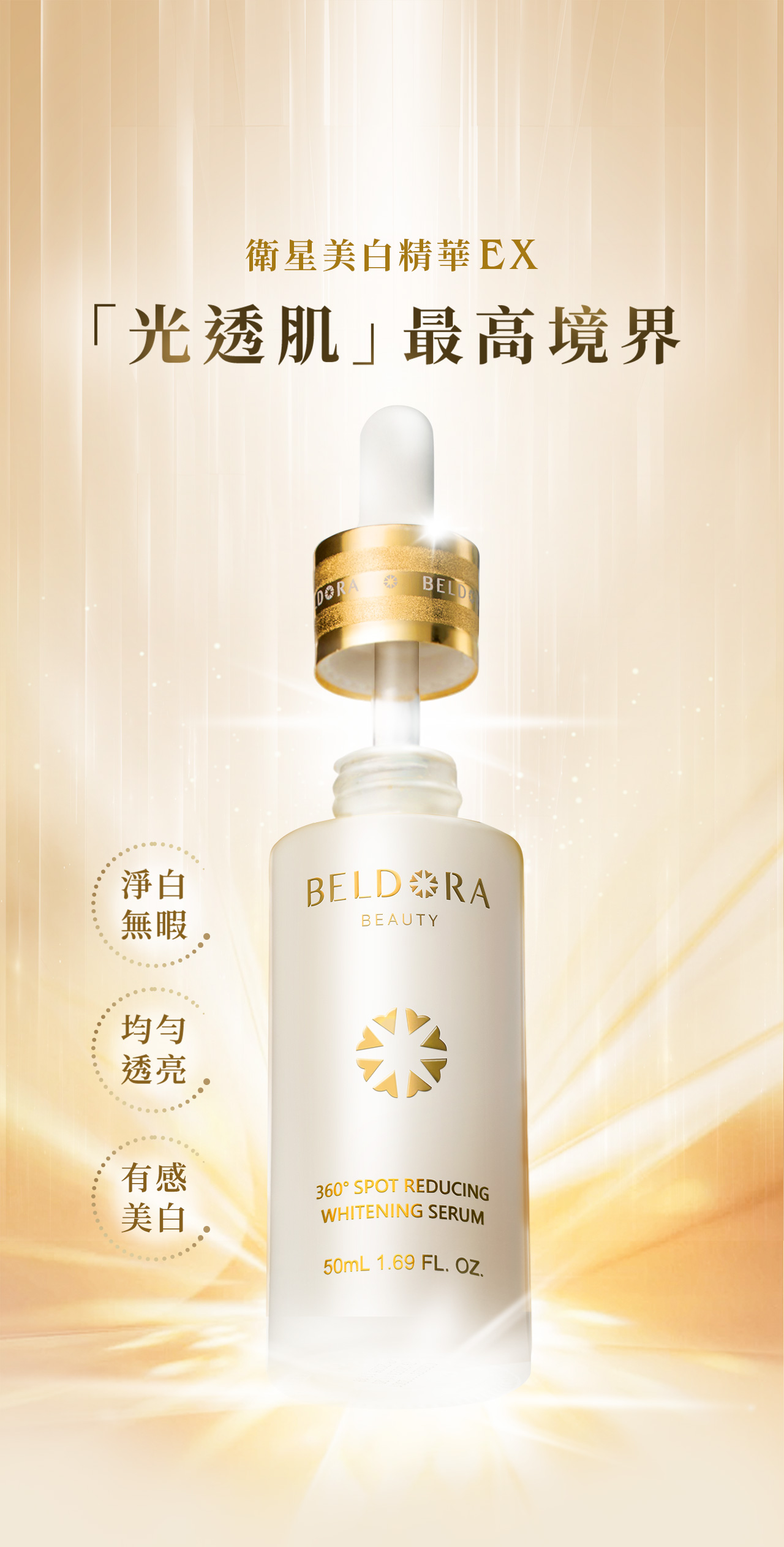 蓓朵娜歷時三年研發,「360°光速淡斑美白精華」,專為美白肌設計,是一瓶能夠全面防堵所有變黑可能的全效精華液。首先舒緩肌膚曬後不適,並全面阻斷黑色素形成,還可以加速肌膚代謝變白,並持續淡化暗沉及斑點。水乳質地,吸收快,一滴四效,如同光速般讓肌膚回復白皙,堪稱美白精華的巔峰之作。