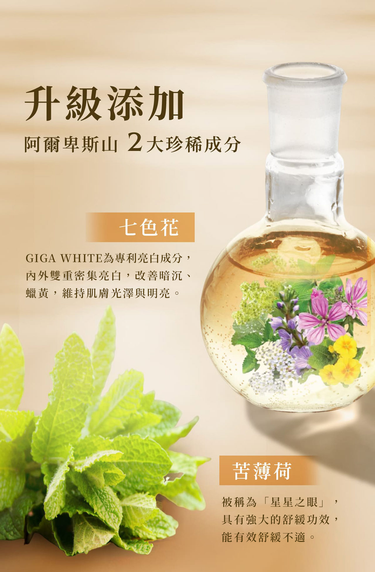 全新升級添加國際公認最有效的美白成分——GIGAWhite,來自阿爾卑斯山有機種植的7色花,能從內、外雙重密集亮白,
