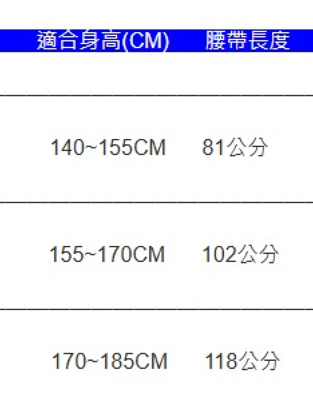 款式(尺碼)適合身高(CM)腰帶長度(公分)背板長度(公分)