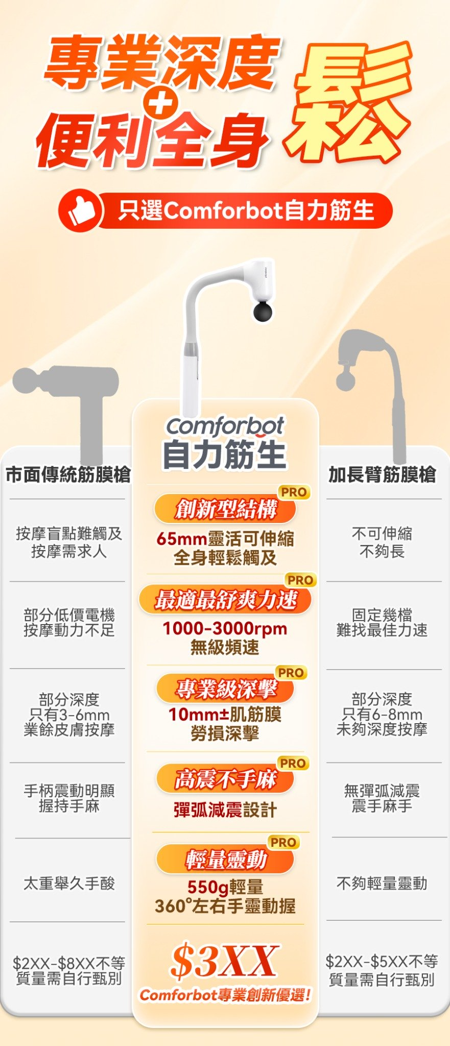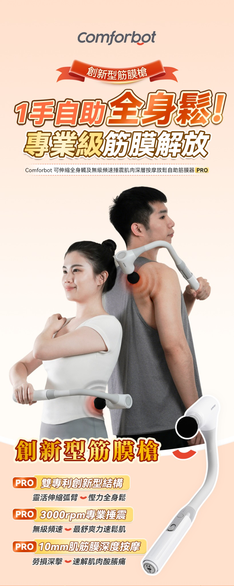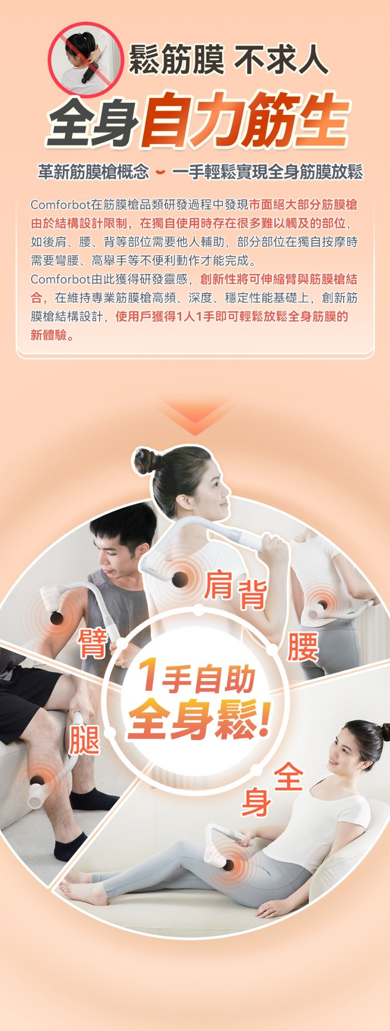 Comforbot可伸縮延長筋膜按摩器,4種按摩頭覆蓋各個肌群、角度自控人體工學弧臂、久持不會手酸手麻,全身都按摩到位!