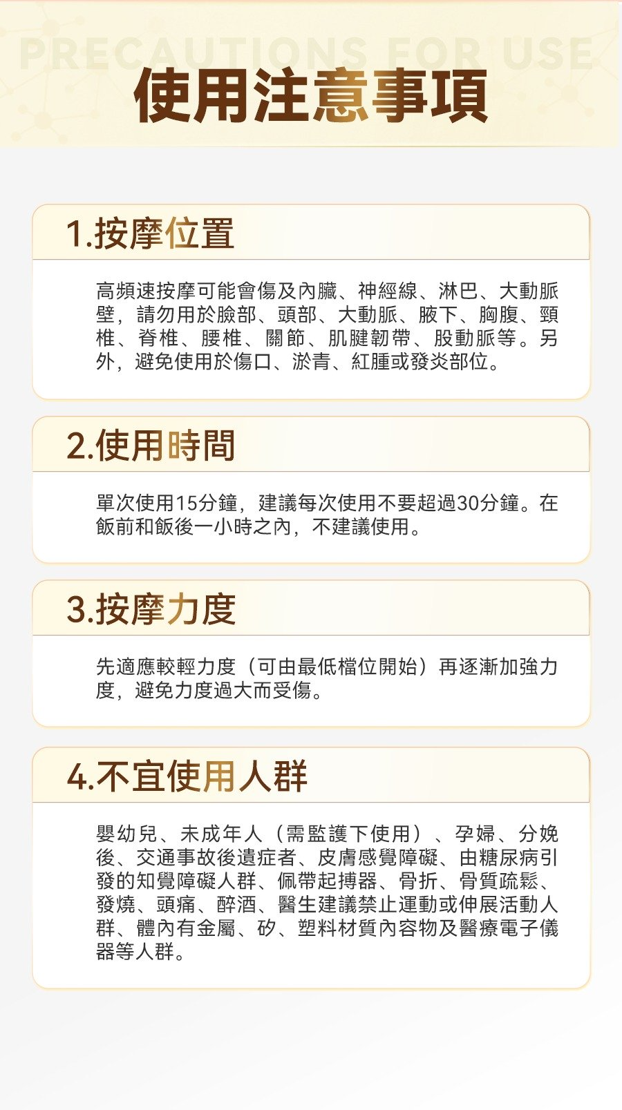 注意:請勿在脊柱、頸部、頭部、關節、骨頭等肌肉薄弱部位使用