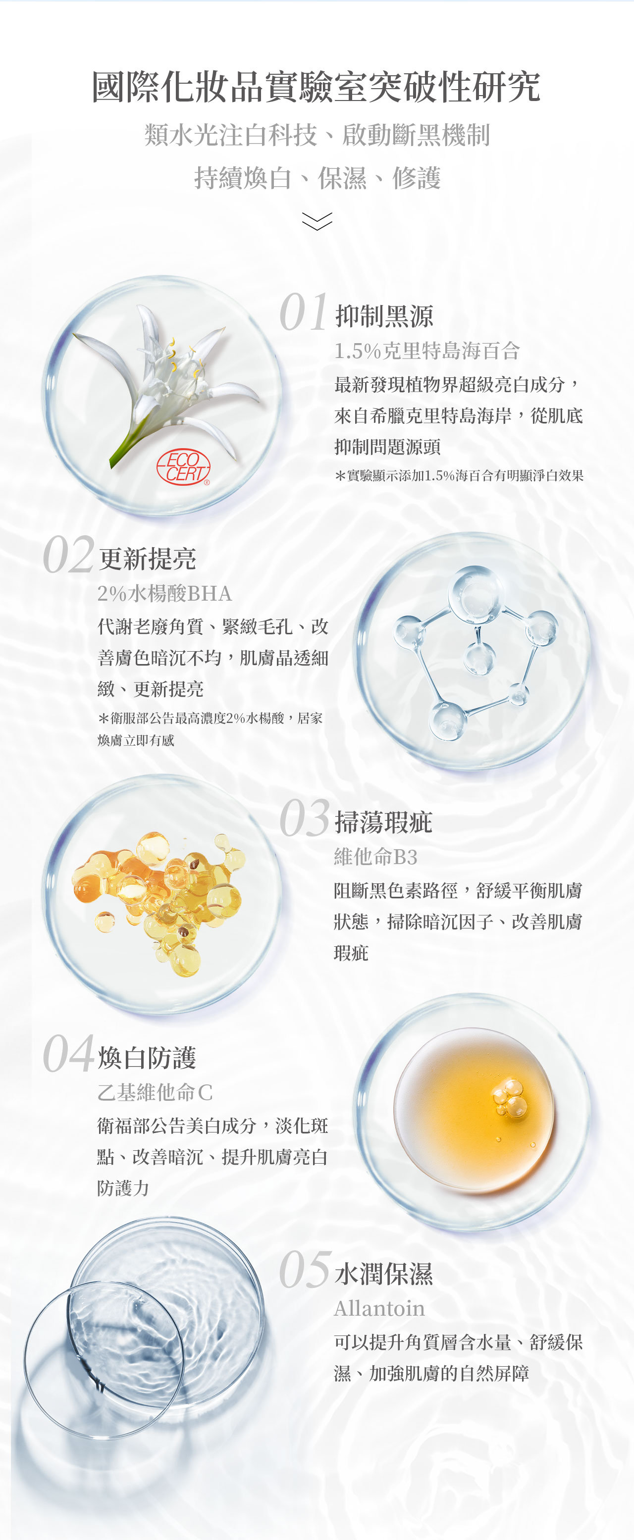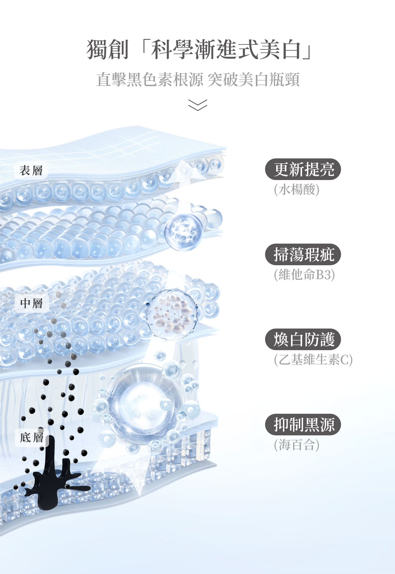 獨創「科學漸進式光感美白」技術,直擊黑色素,突破美白瓶頸