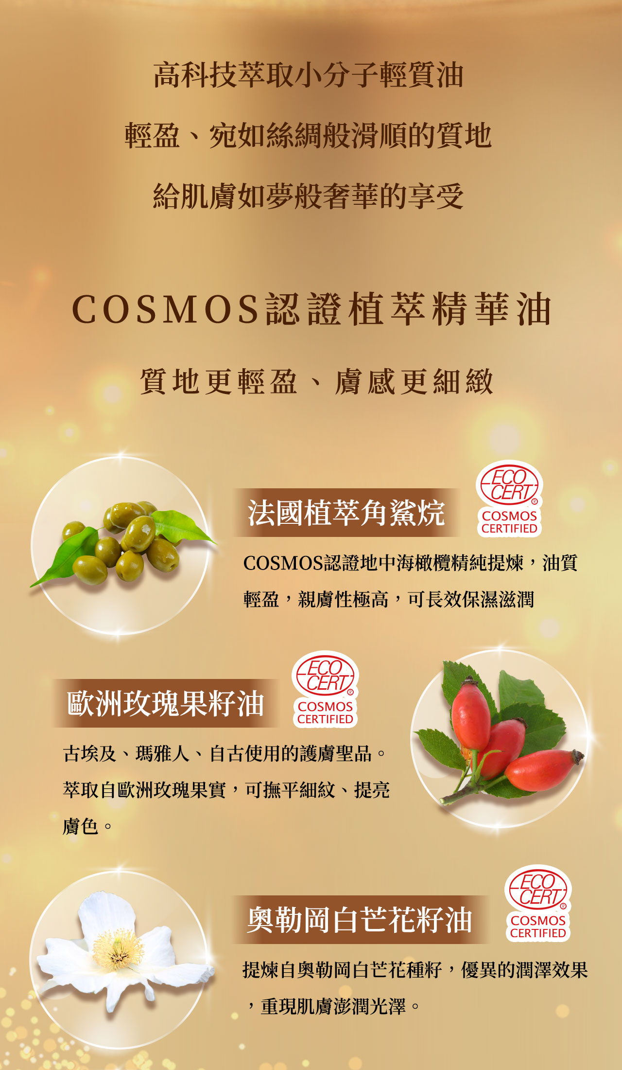 採用高科技萃取出質地輕柔的小分子精華油,宛如絲綢般滑順,格外輕爽不油膩,讓肌膚保持油水平衡,增強防護及抵抗力,防止肌膚老化,維持肌膚健康。
