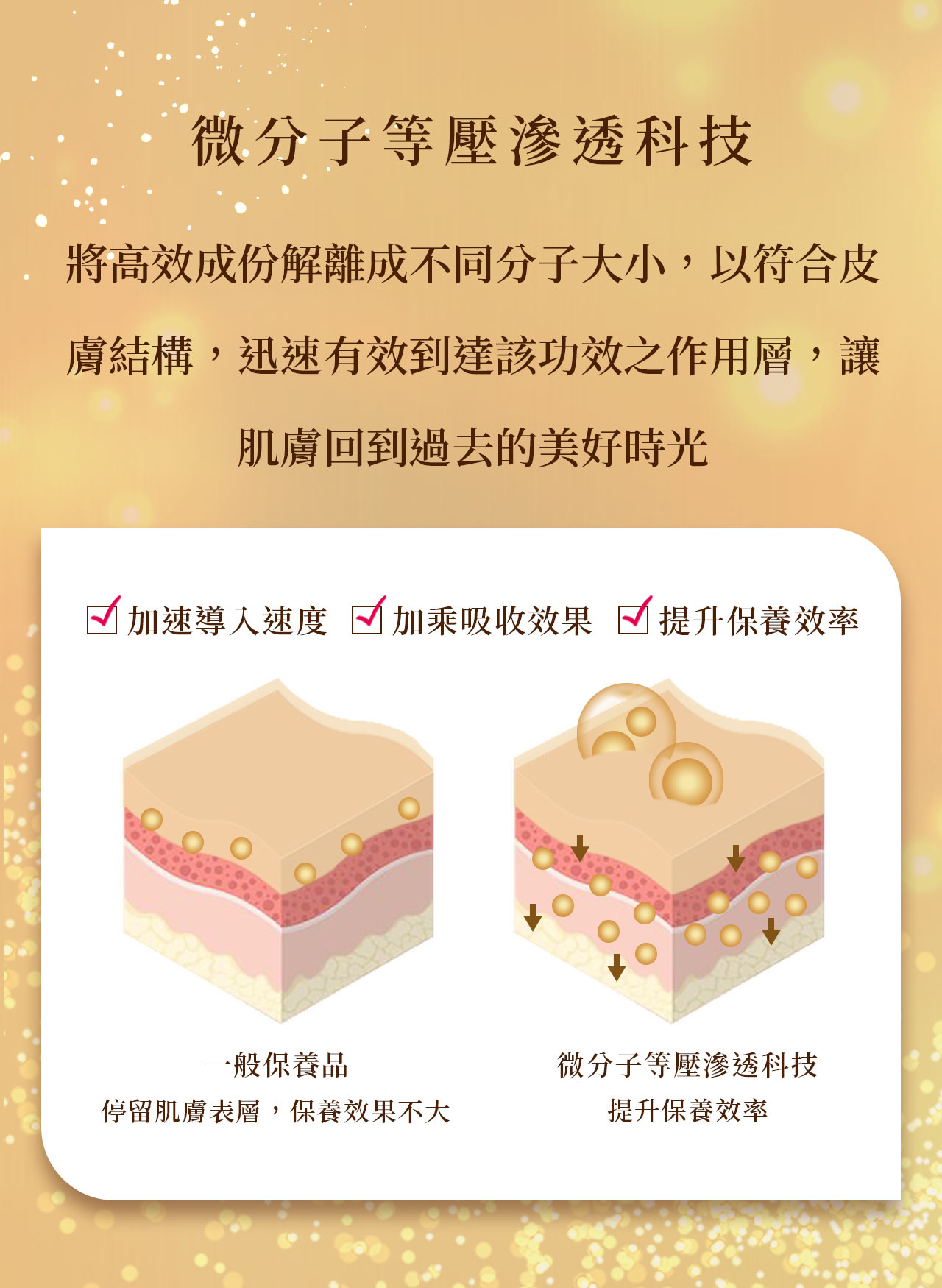 將保養成分層析解離成不同分子大小,以符合皮膚結構,迅速滲透皮脂膜,有效吸收到達該功效之作用層,讓保養更有效率