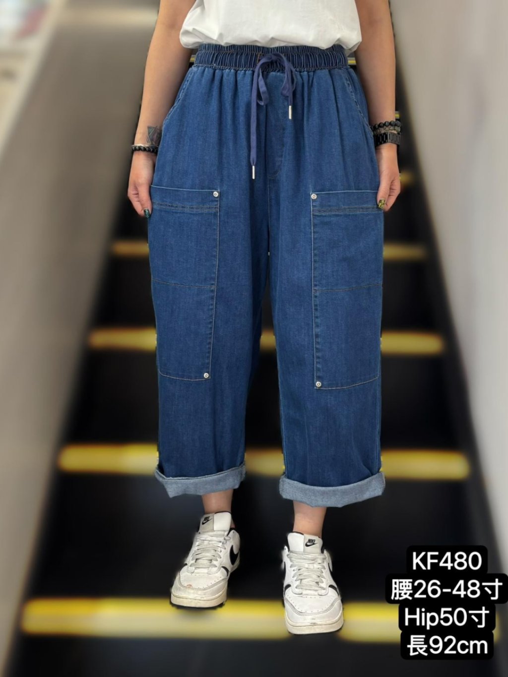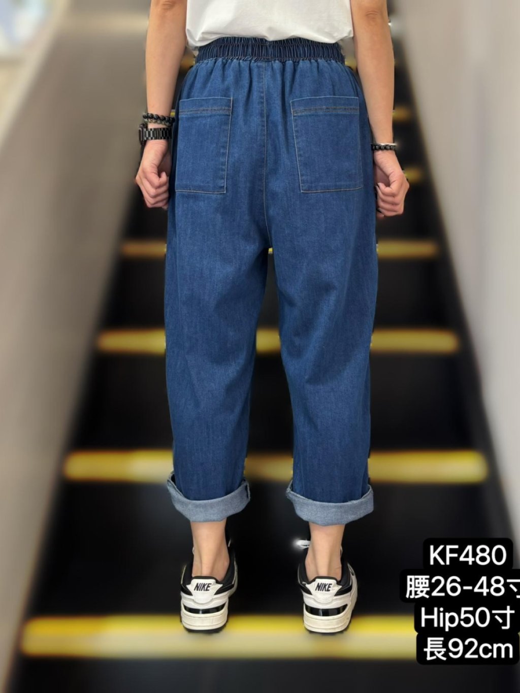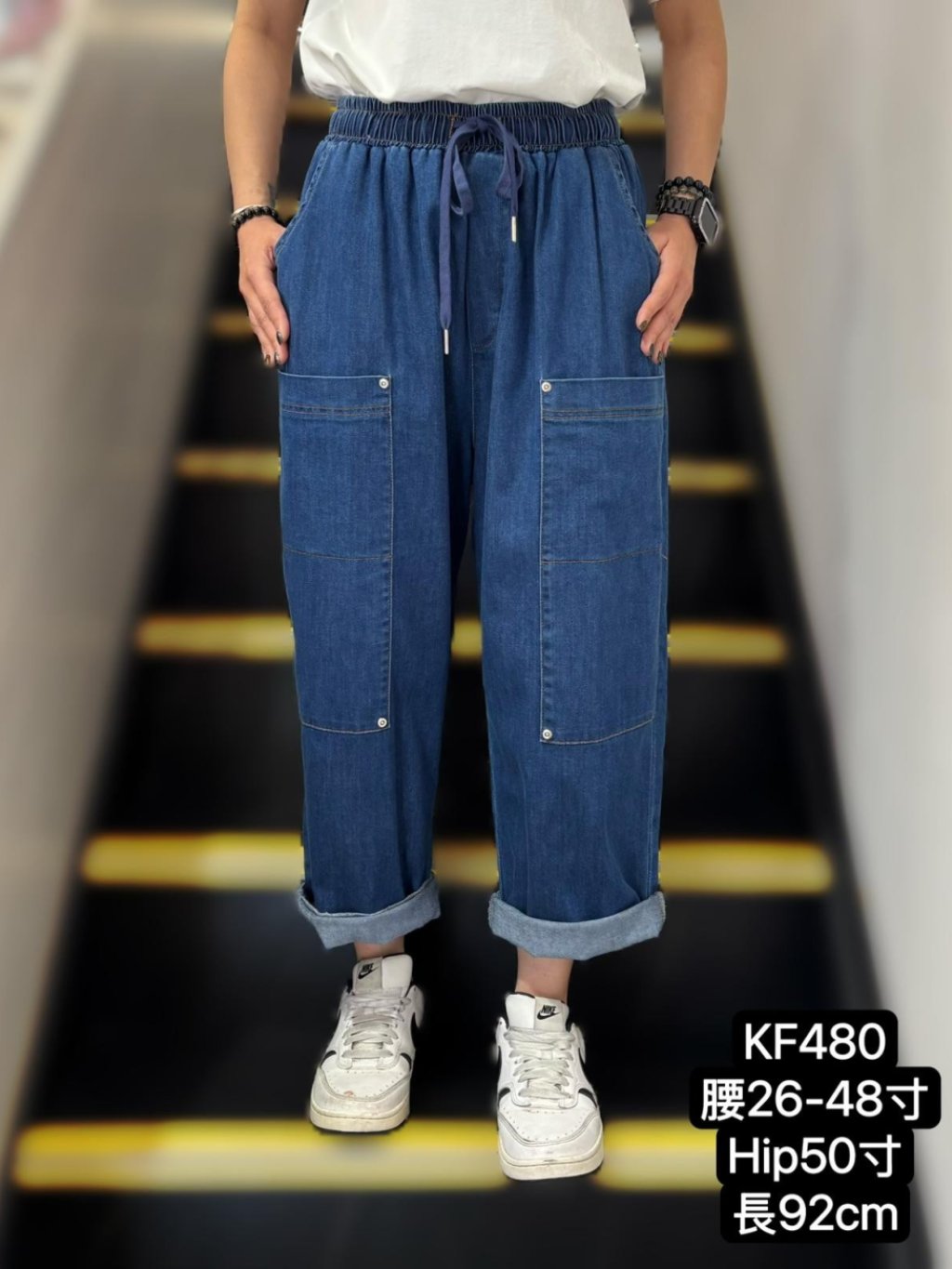 KF480 全橡筋腰兩邊鍋釘袋牛仔長褲 $170