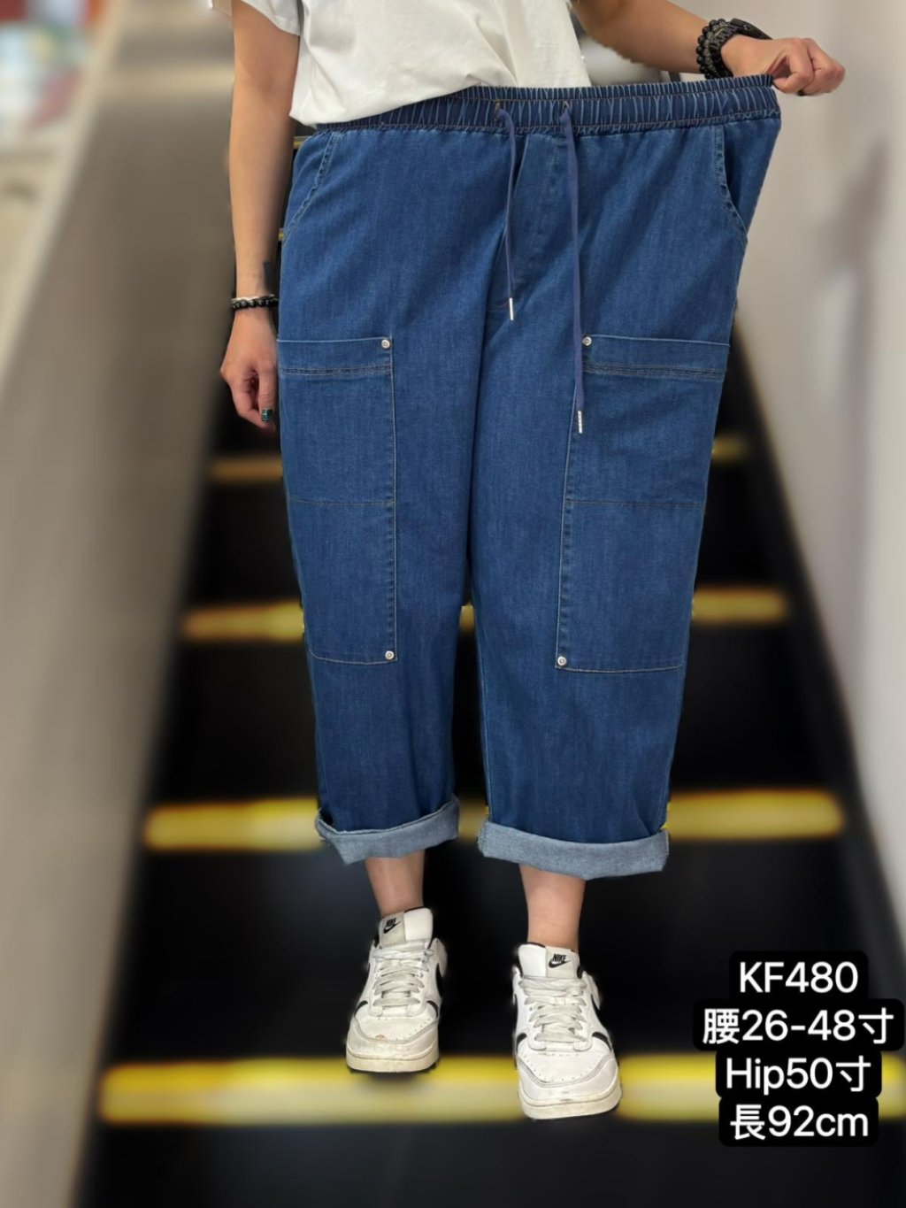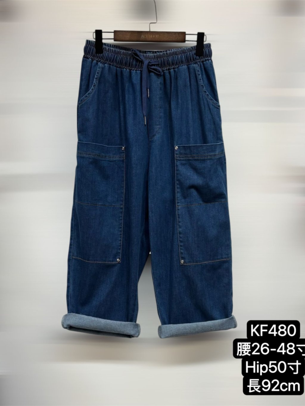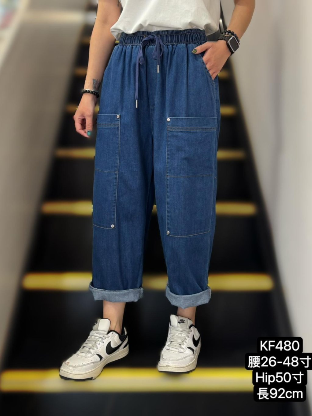 KF480 全橡筋腰兩邊鍋釘袋牛仔長褲 $170