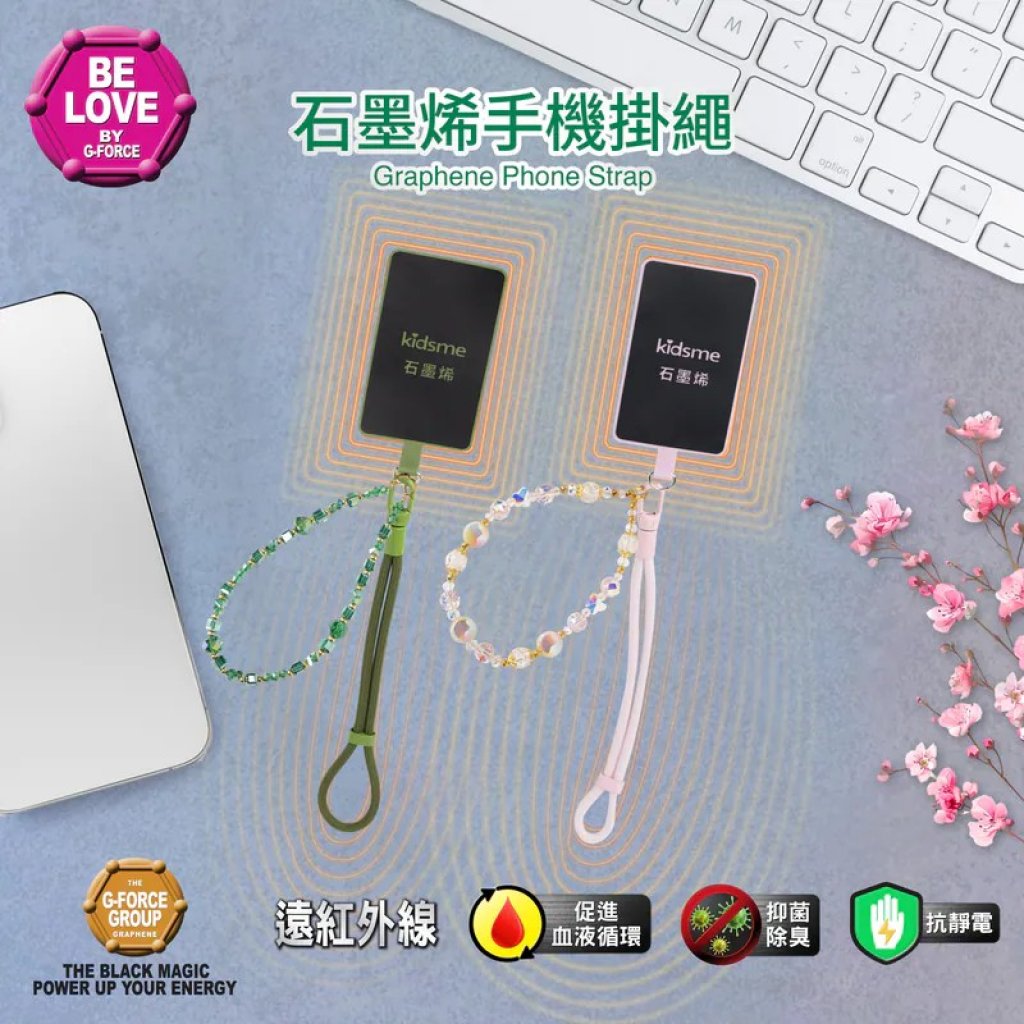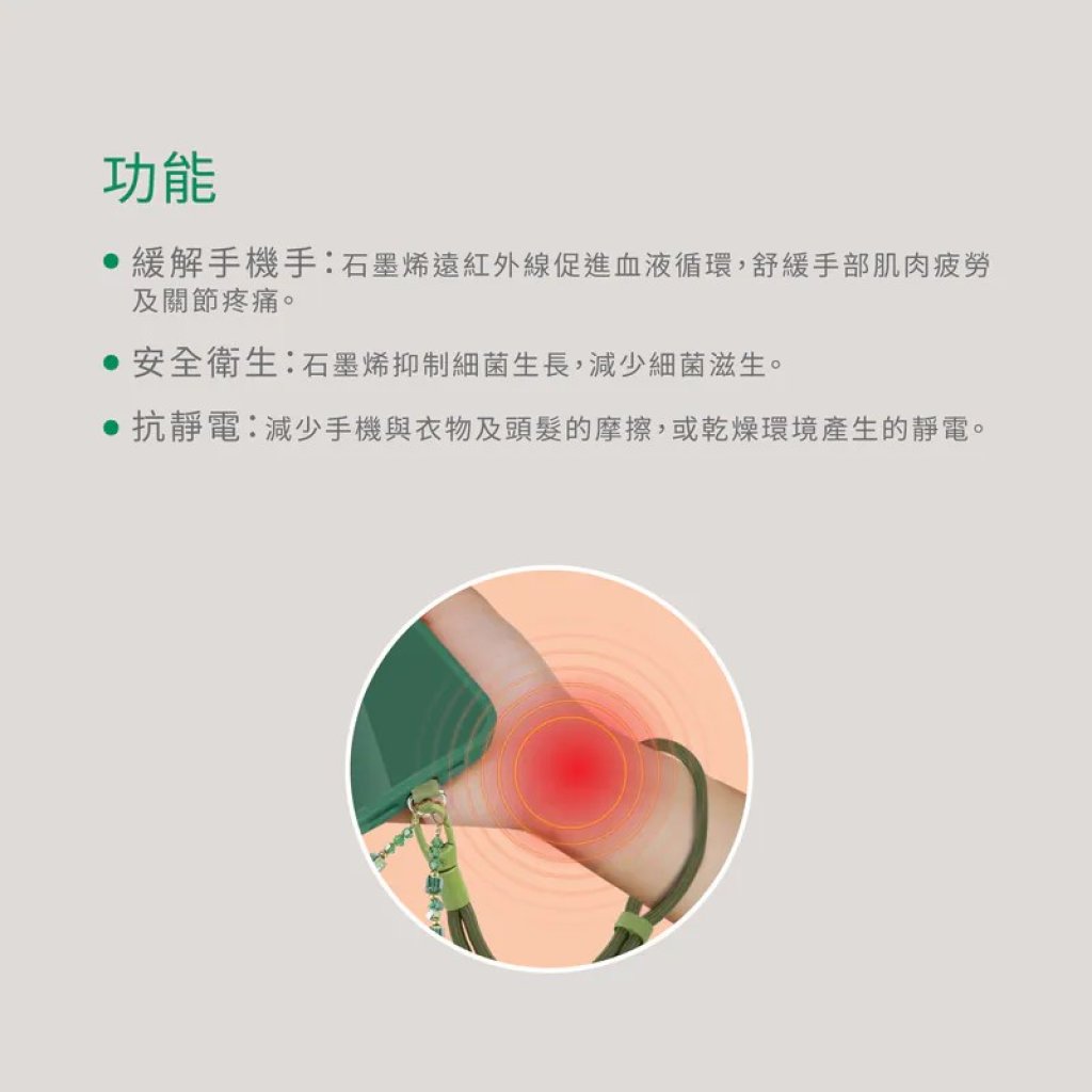 石墨烯手機掛飾有效防摔防丟,同時利用石墨烯 遠紅外線技術促進手部血液循環,減少靜電積聚, 避免觸電感,提升舒適感。此外,掛繩採用石墨 烯抗菌材料,能夠抑制細菌生長,維護手部健康。