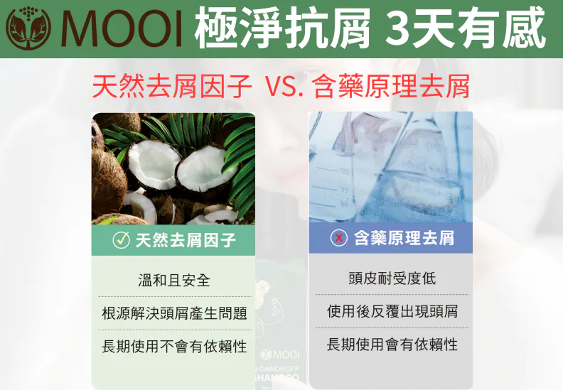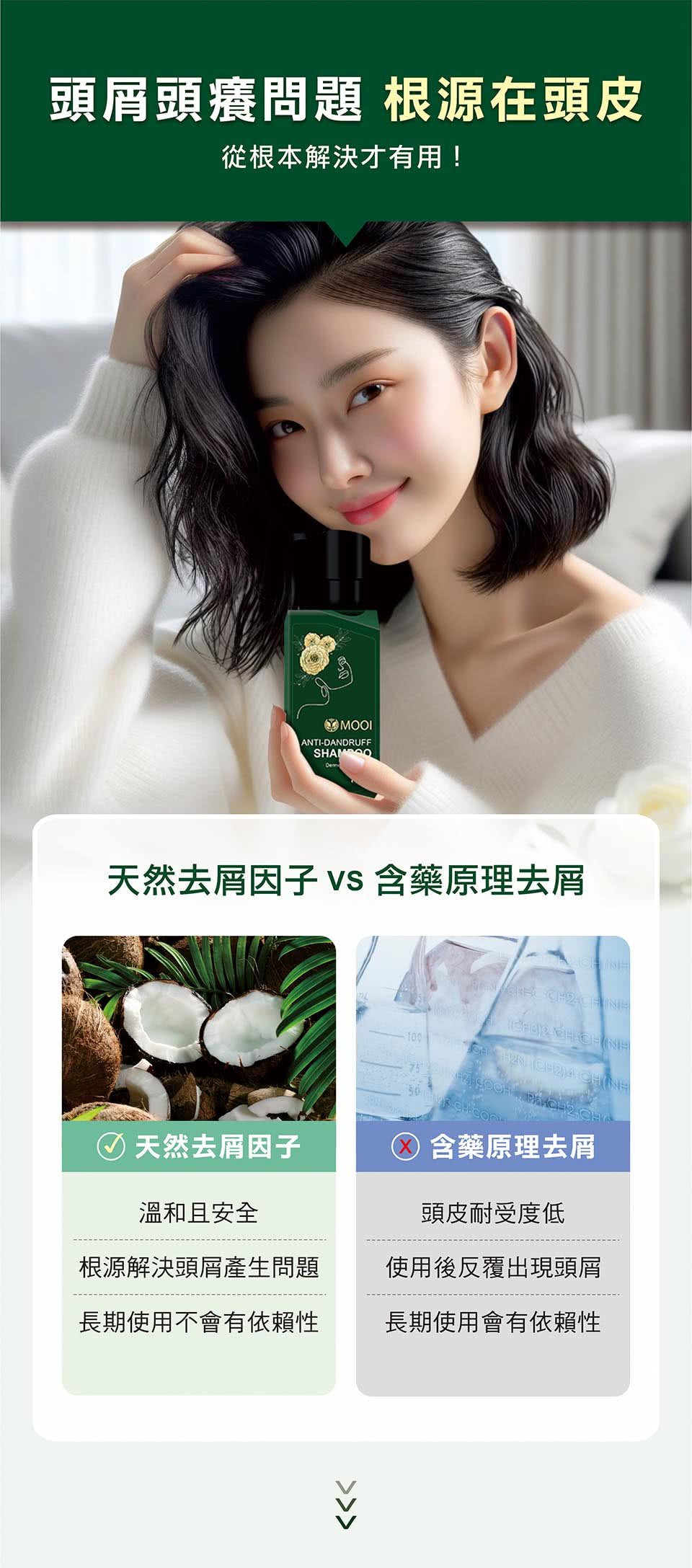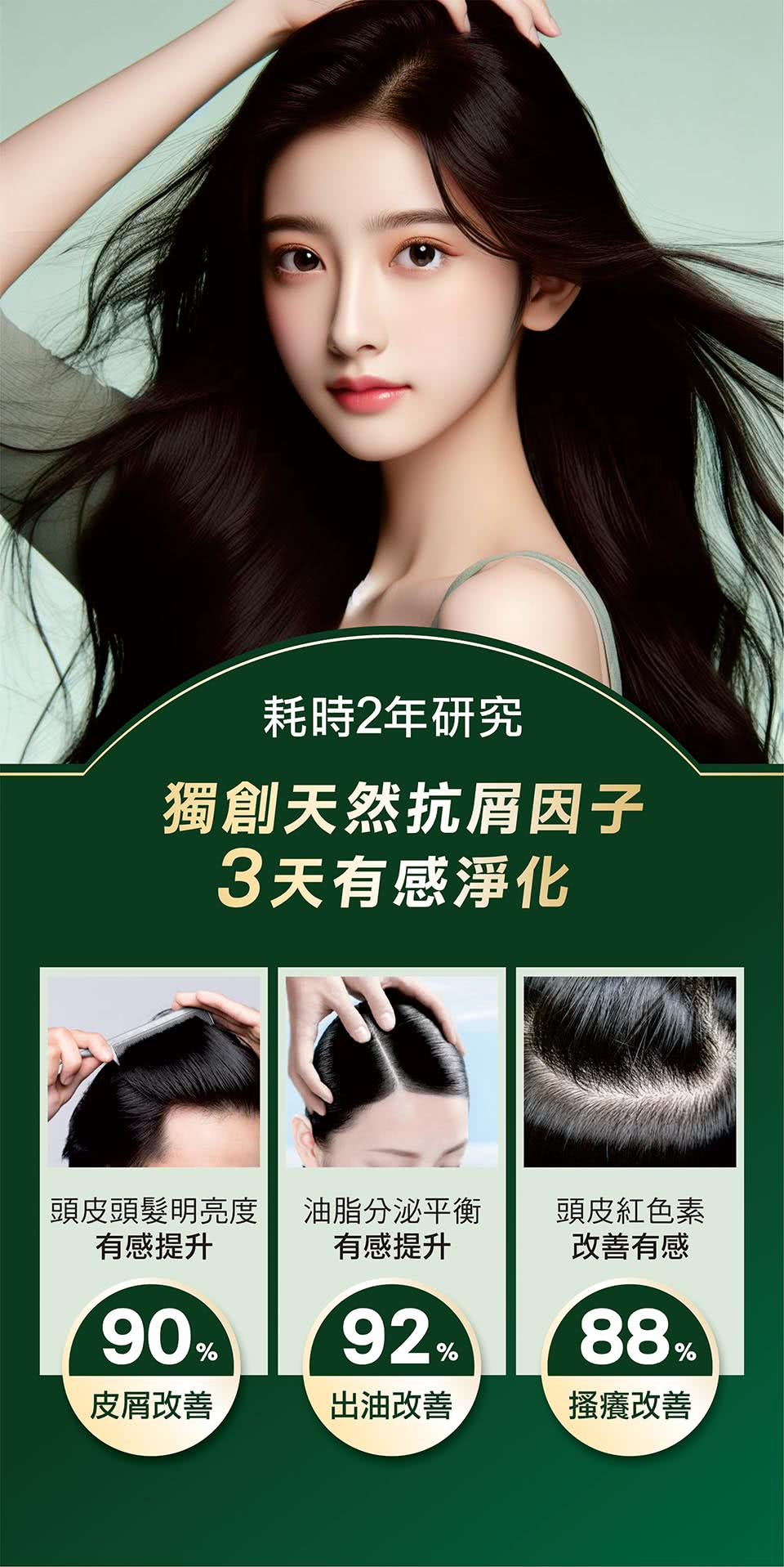 天然去屑因⼦ - 溫和且安全,根源解決頭屑產生問題,長期使用不會有依賴性