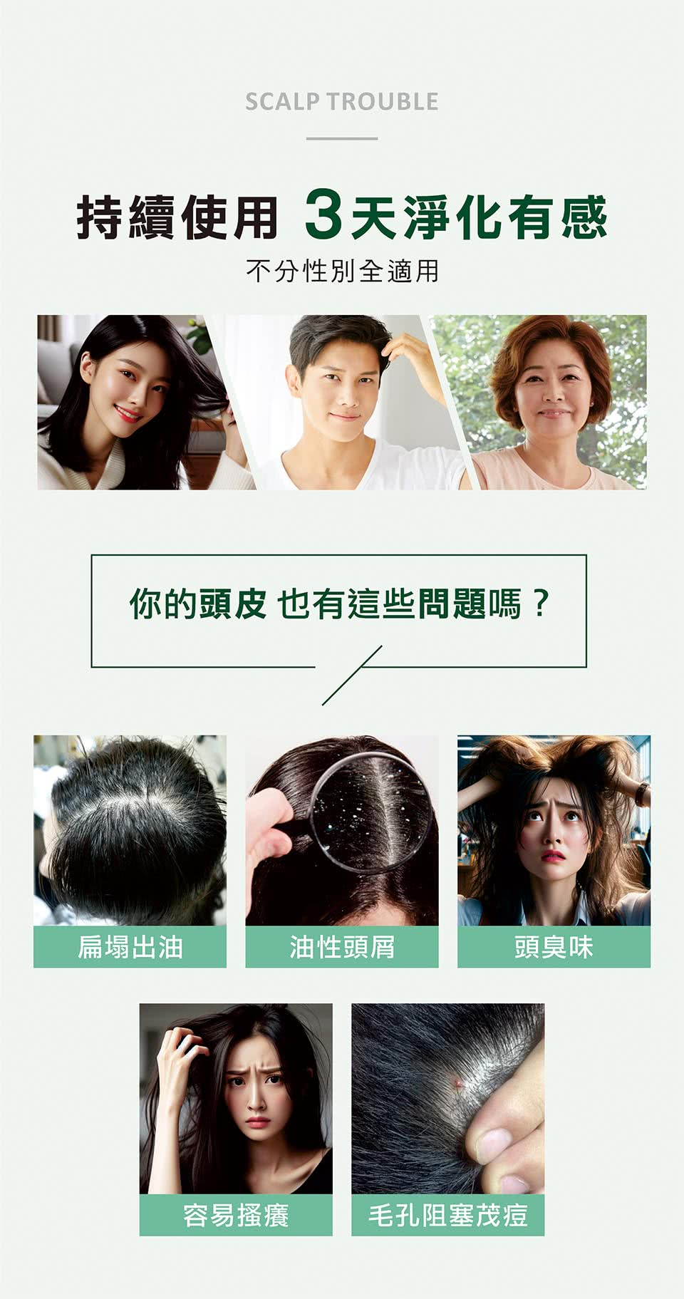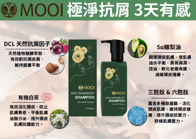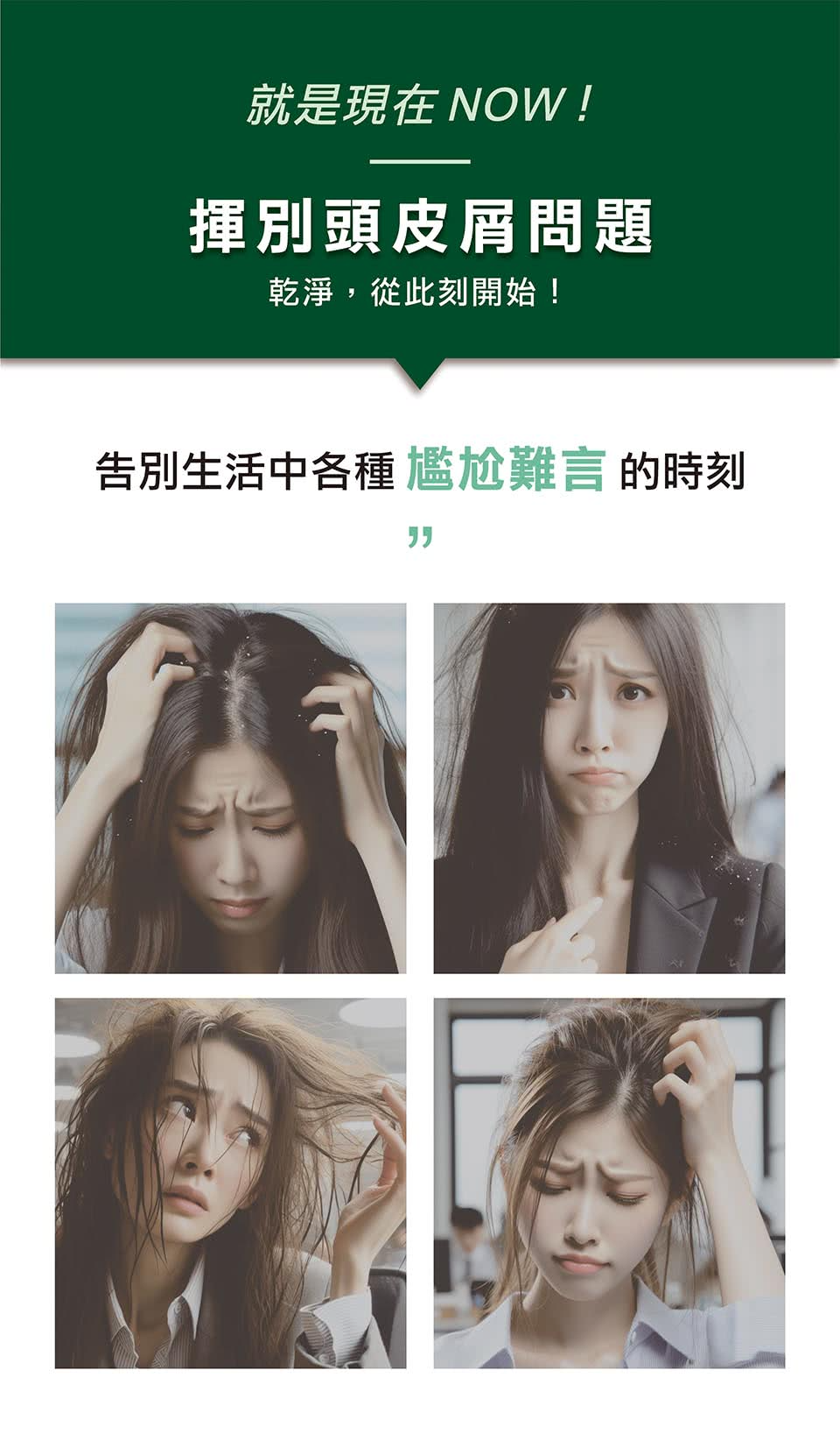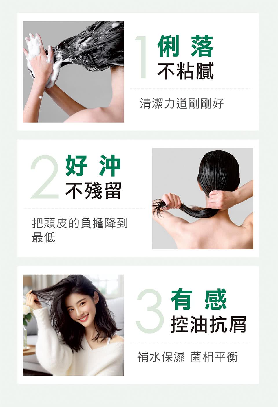 天然去屑因⼦ - 溫和且安全,根源解決頭屑產生問題,長期使用不會有依賴性