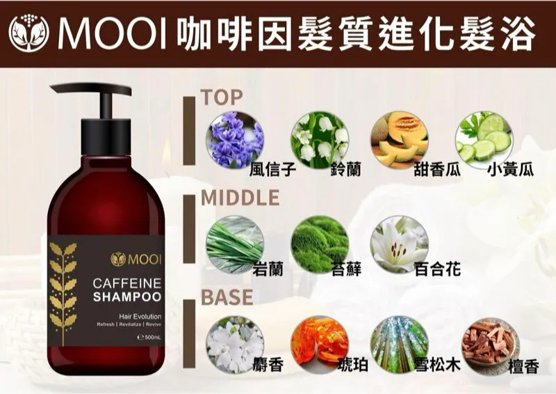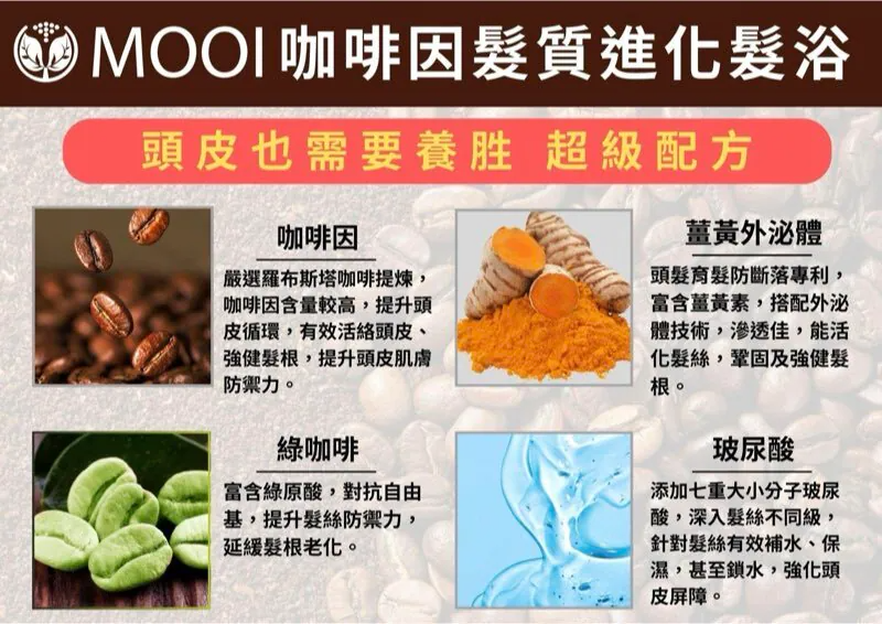 🔹咖啡因:嚴選羅布斯塔咖啡提煉,咖啡因含量較高,提升頭皮循環,有效活絡髮絲、強韌髮幹,減少斷髮。
