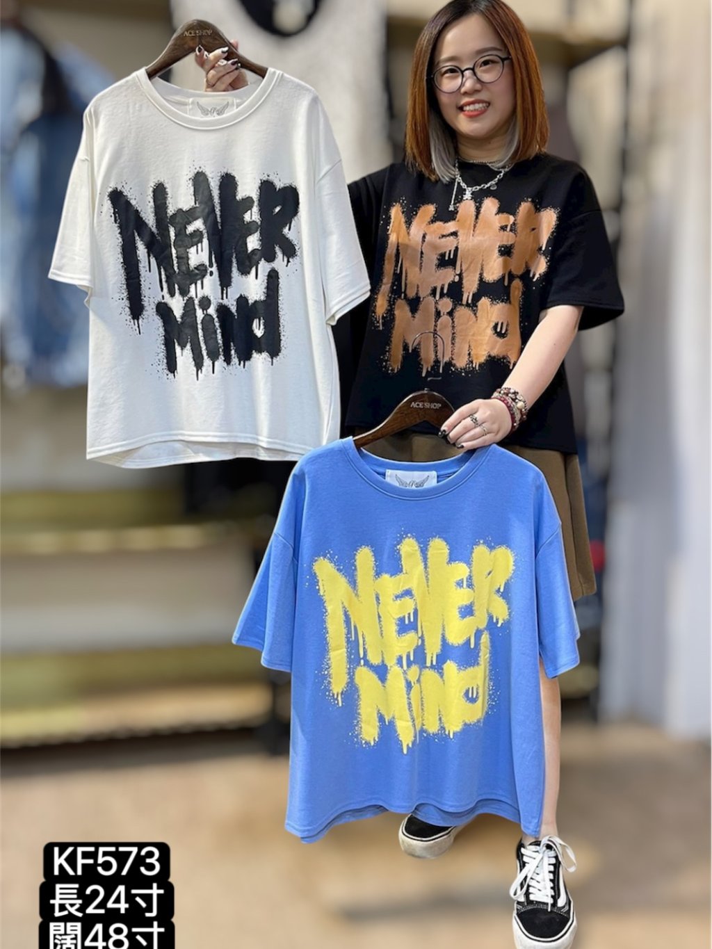 KF573 棉料印字TOP 黑、白、藍 長24寸 闊48寸 $159