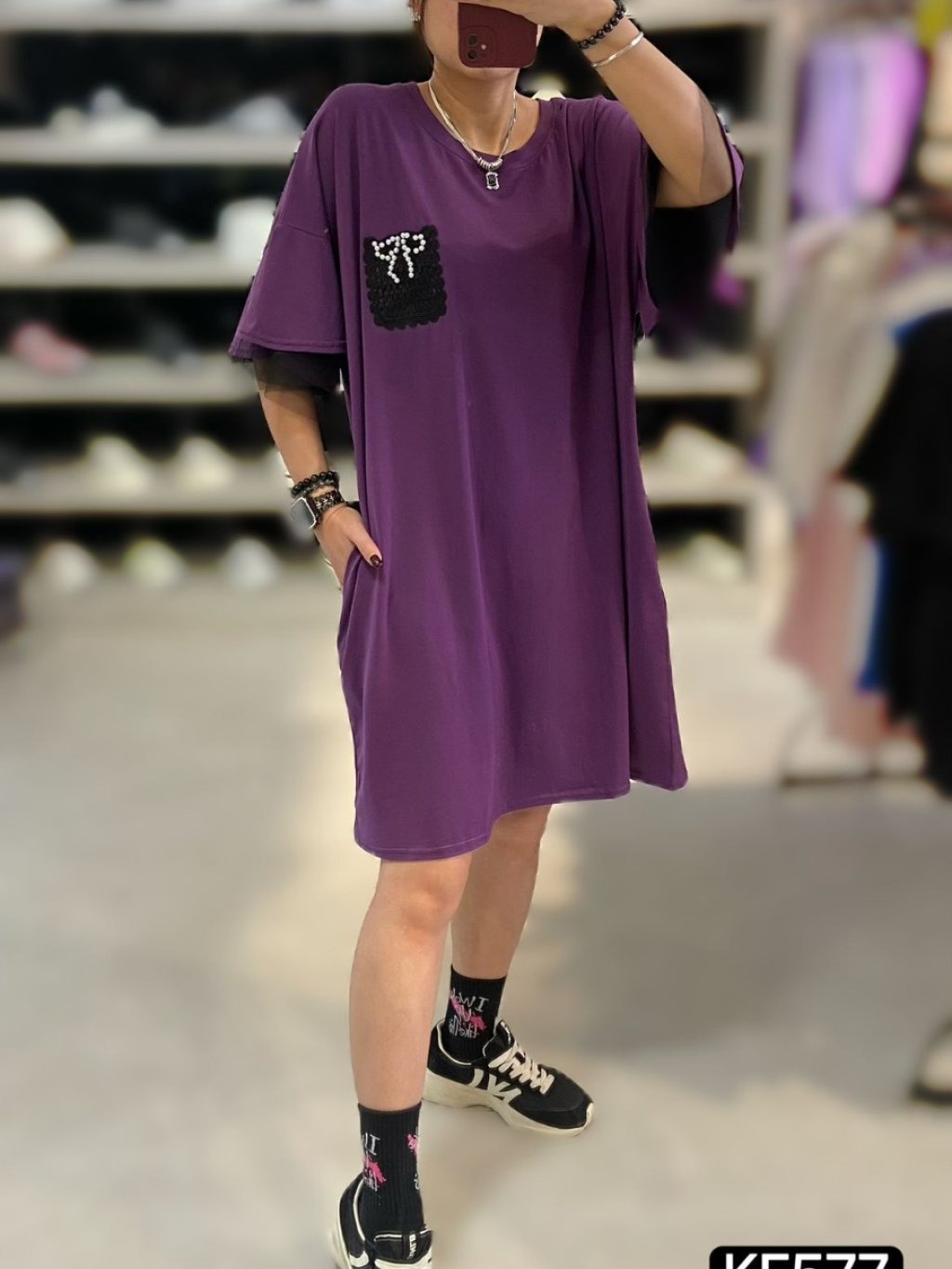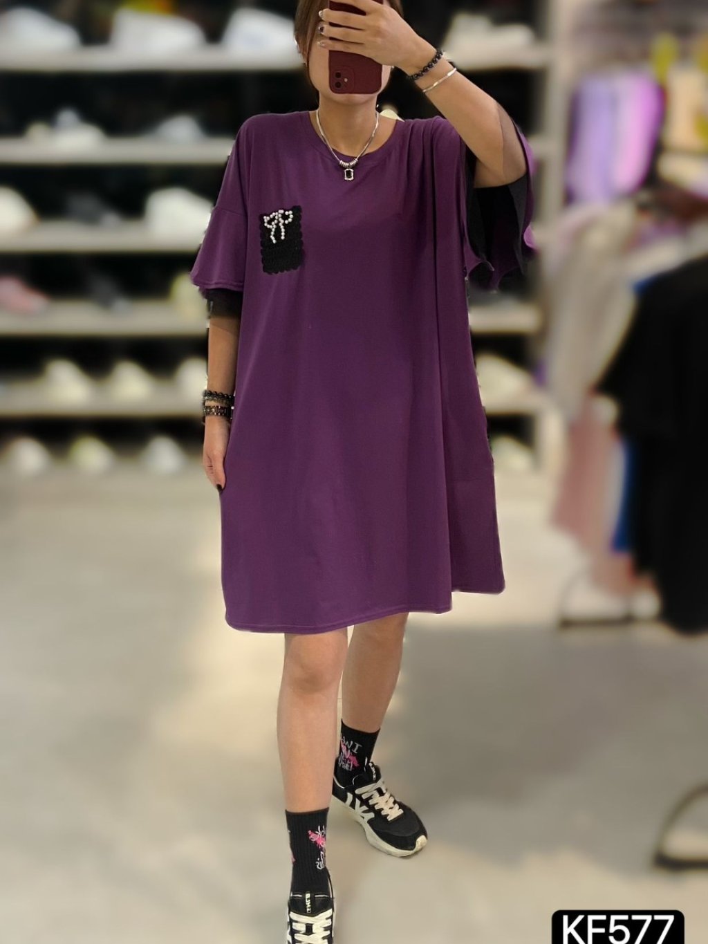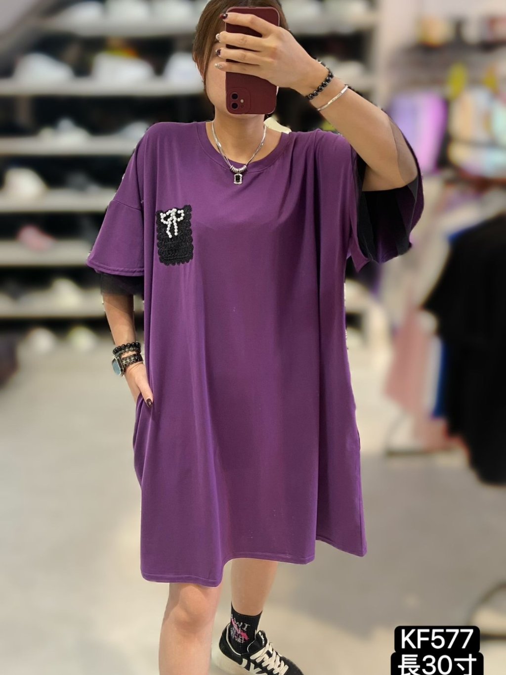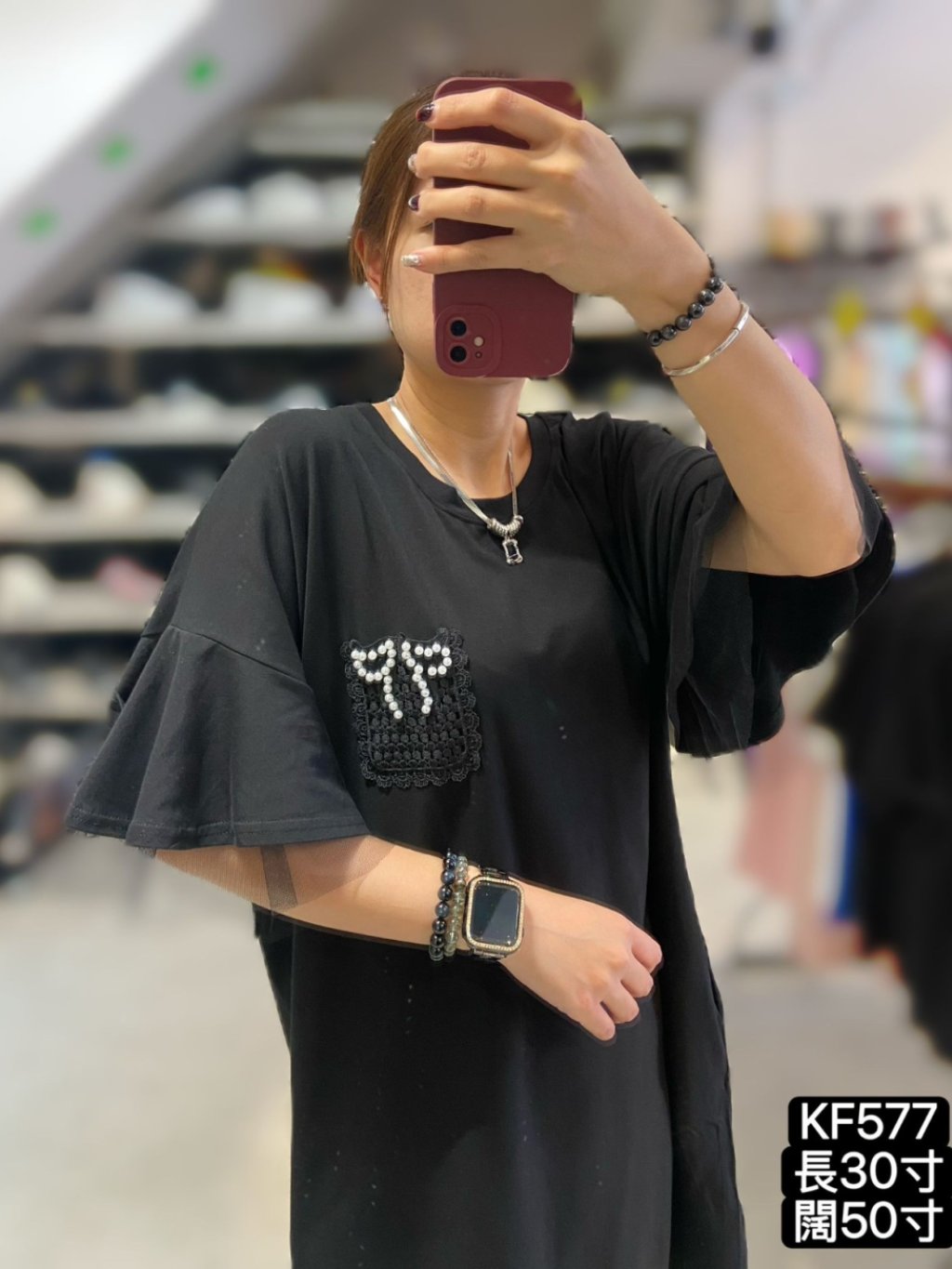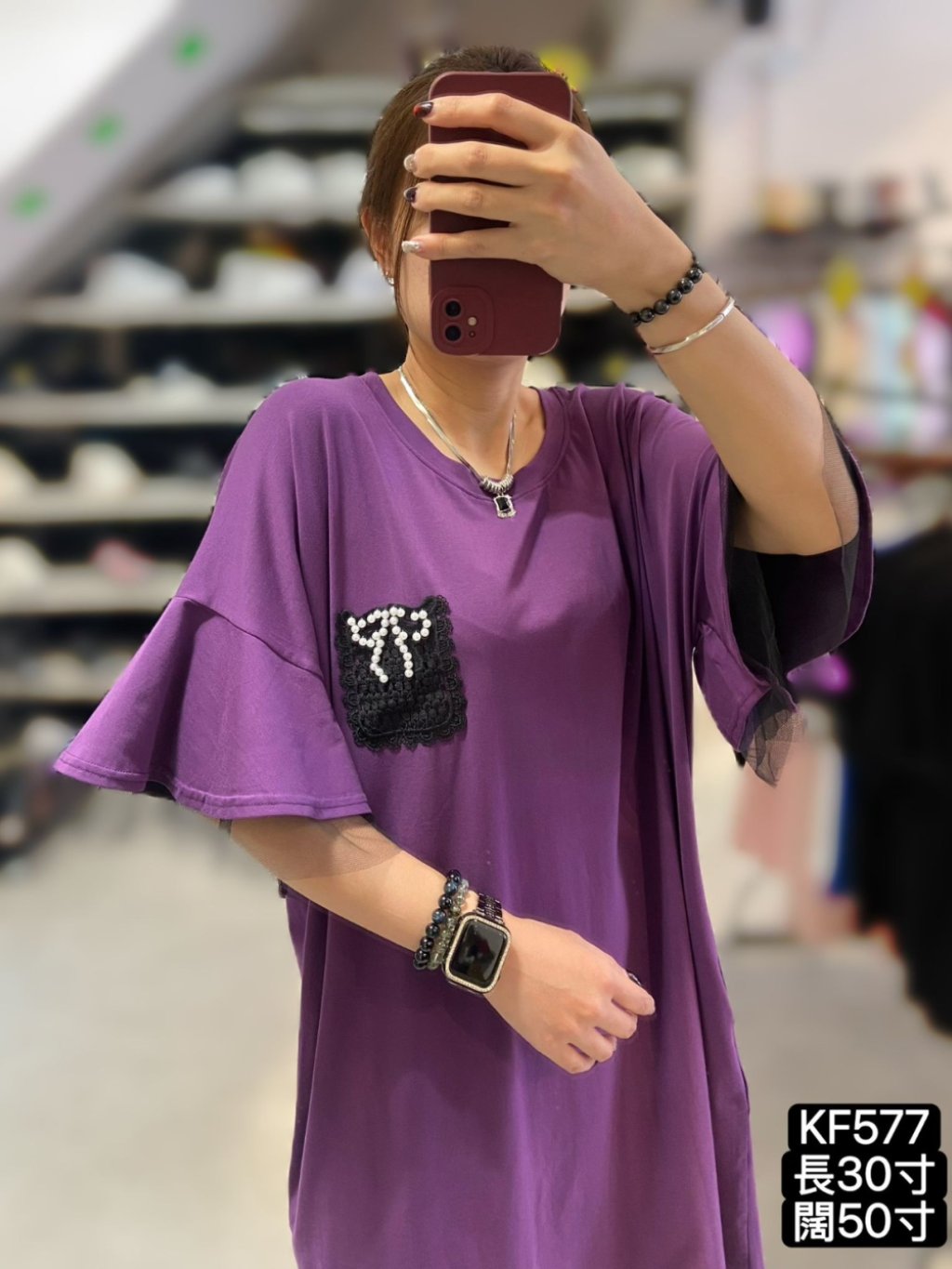 KF577 棉料重工勾花蝴蝶結雙重ruffle袖OPS 長37寸 闊50寸 黑、紫 $169