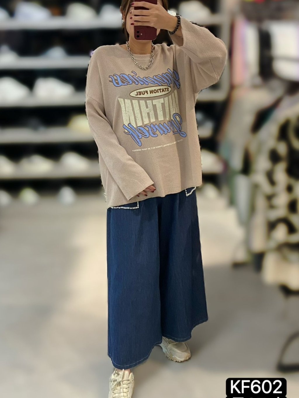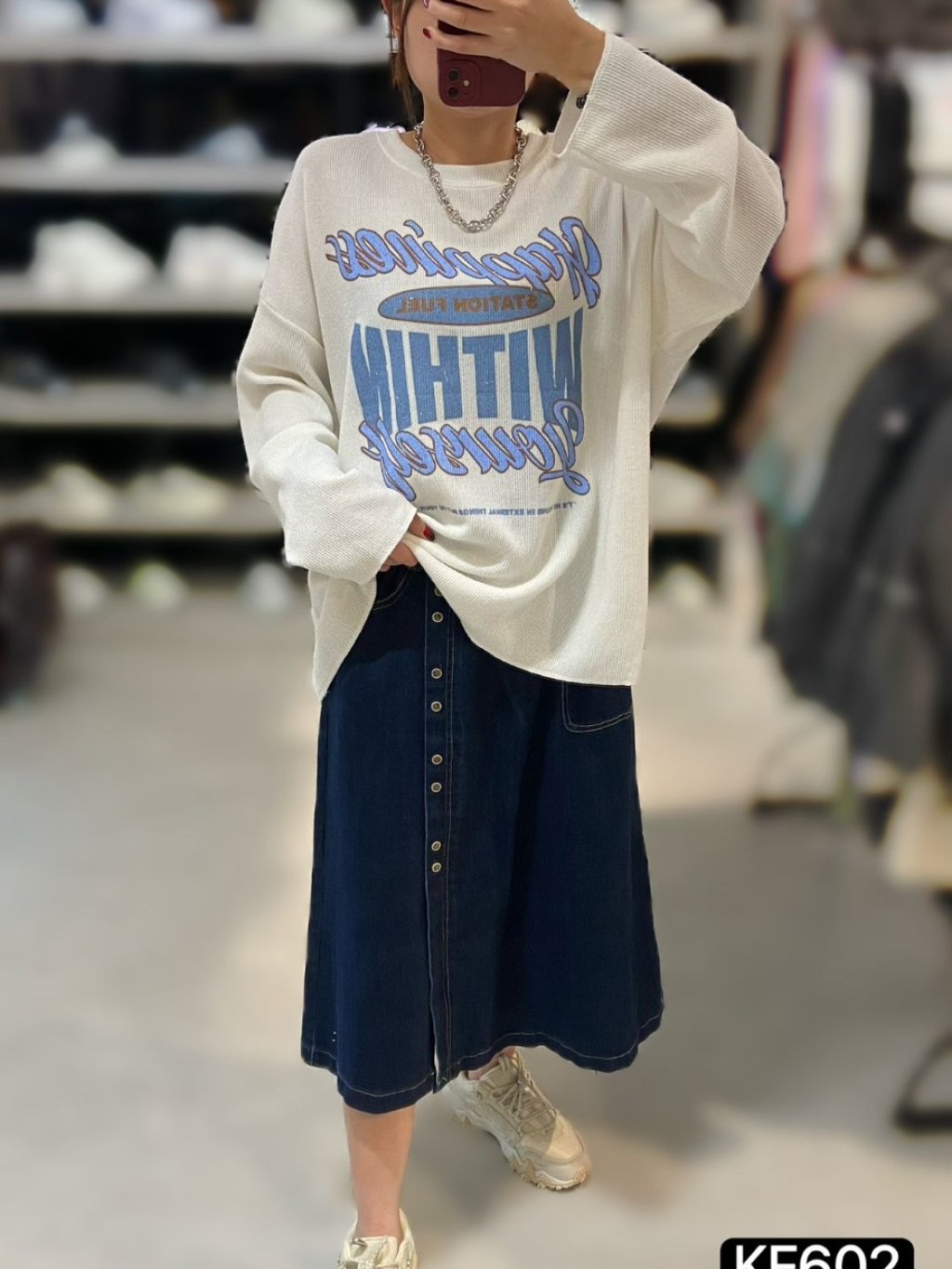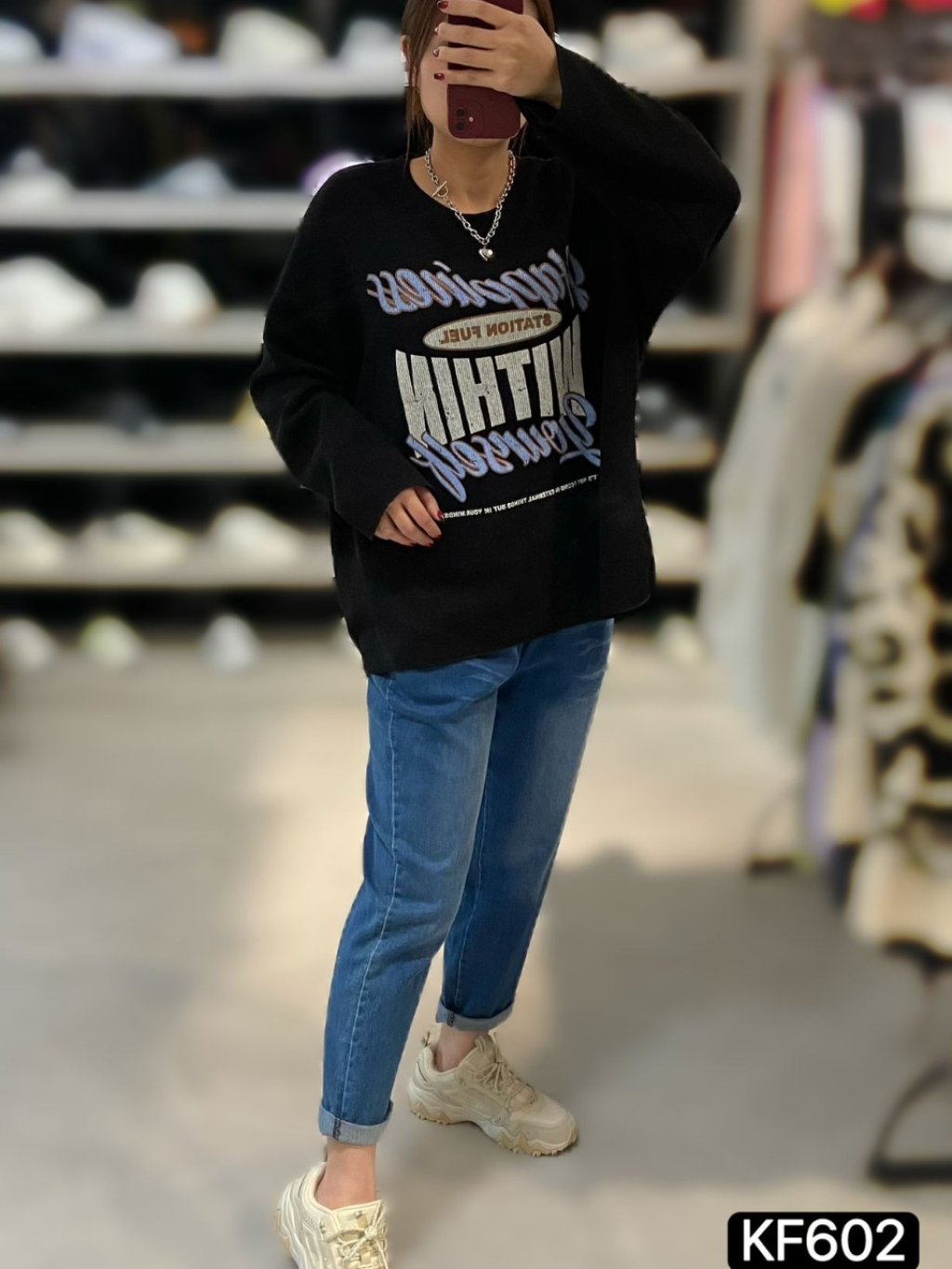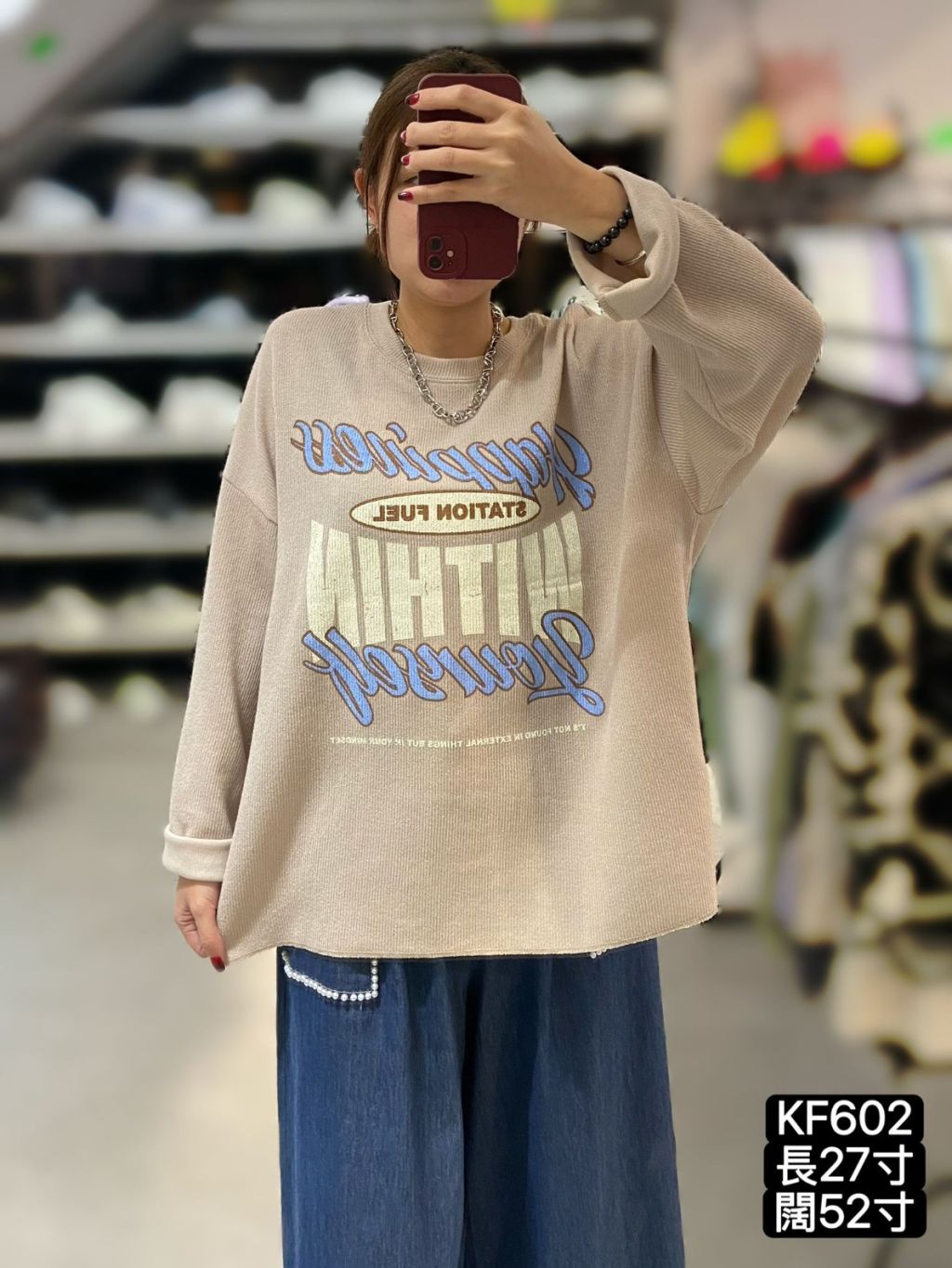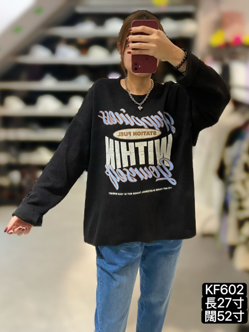 KF602 針織印字長袖TOP 長27寸、闊52寸 $159 白、杏、黑