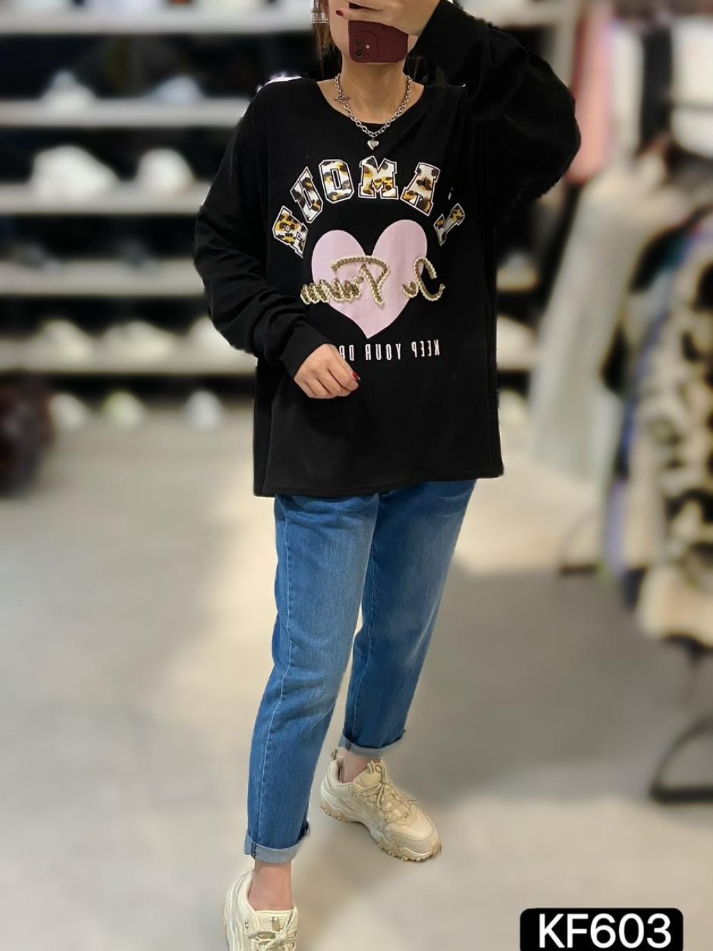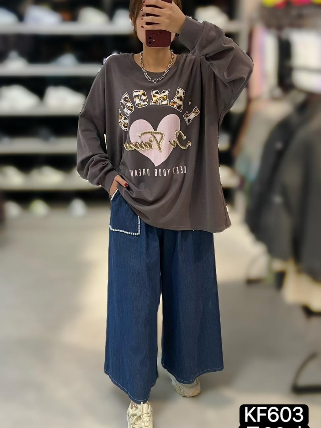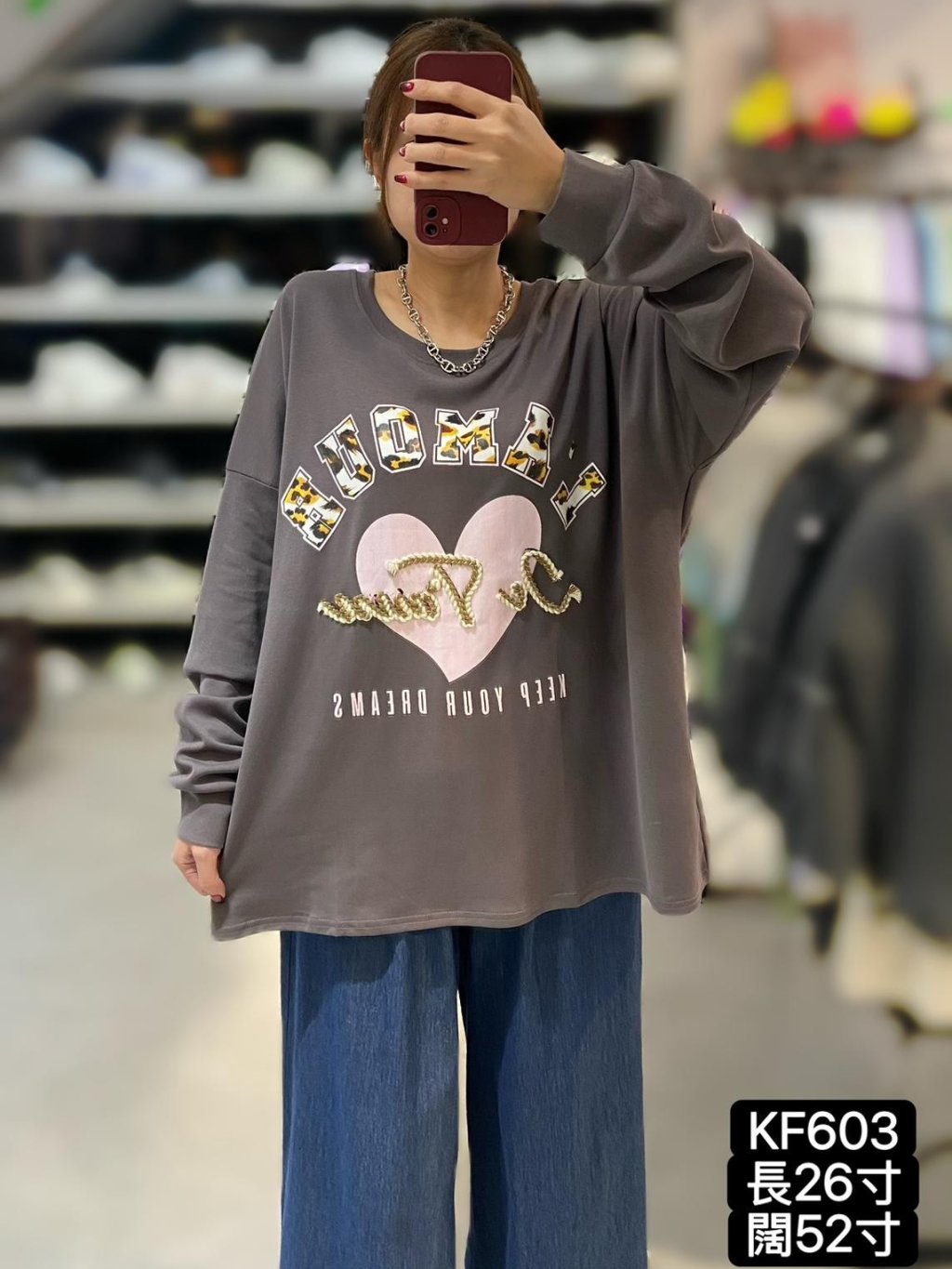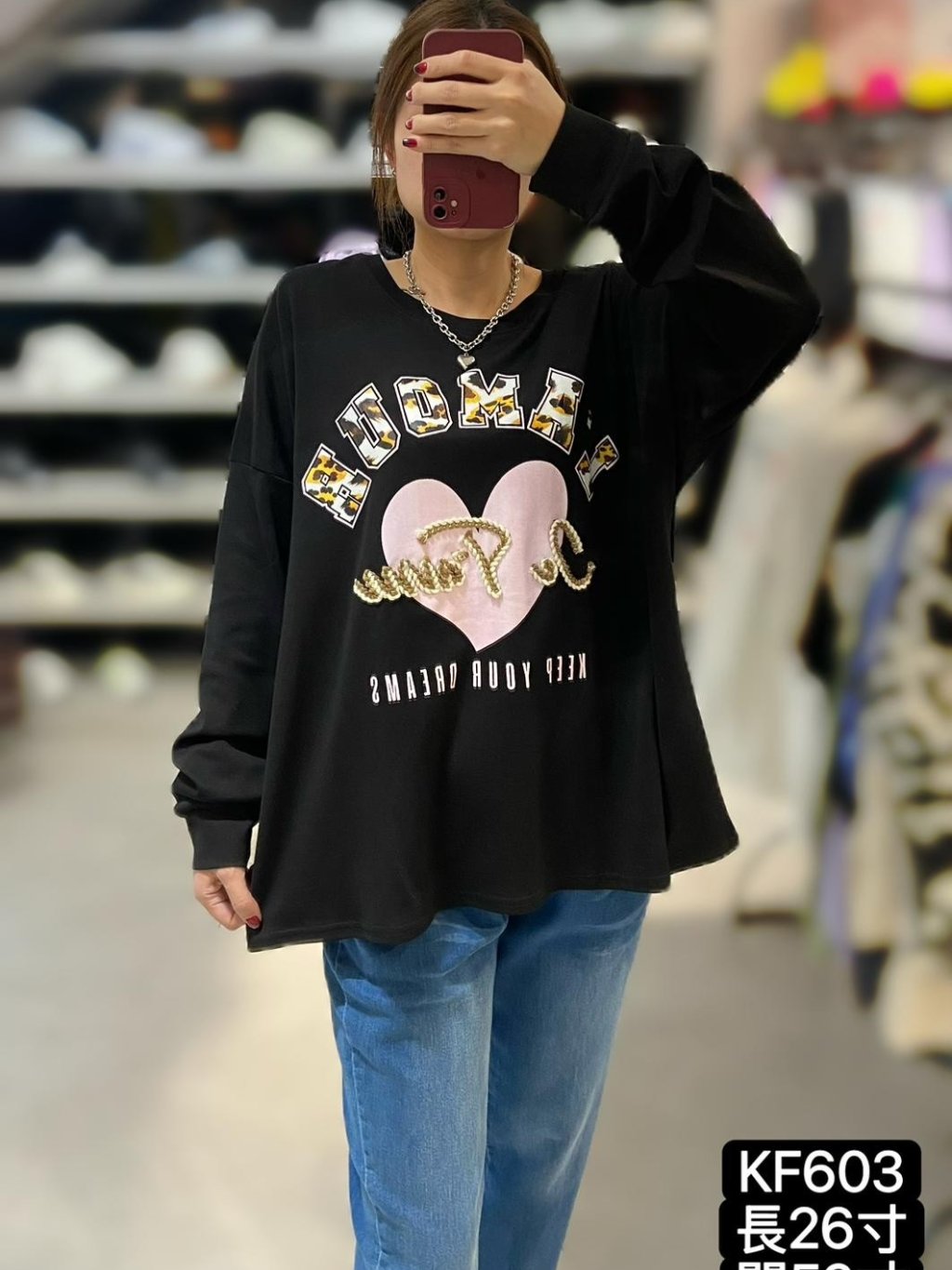 KF603 棉料豹紋印字心心立體編織字長袖TOP 長26寸 闊52寸 $149 黑、灰