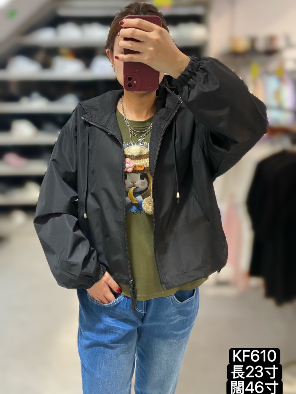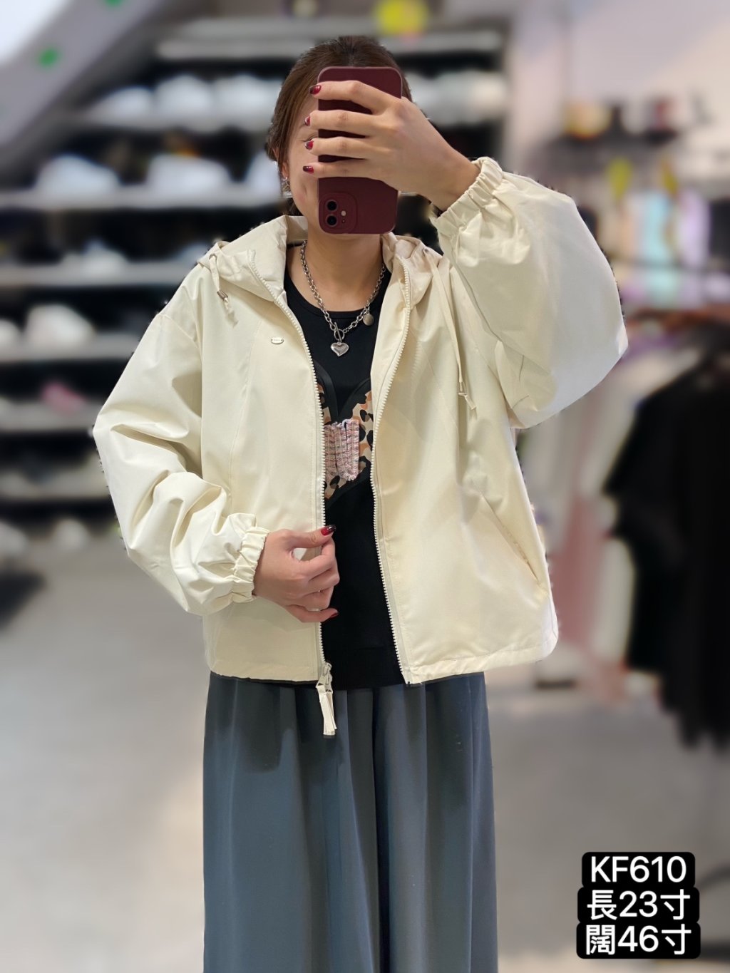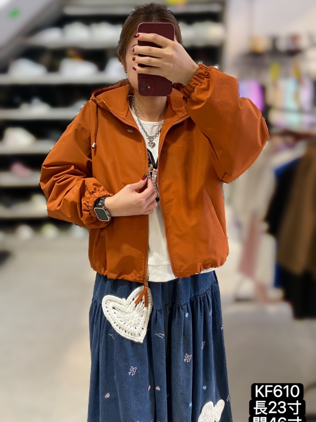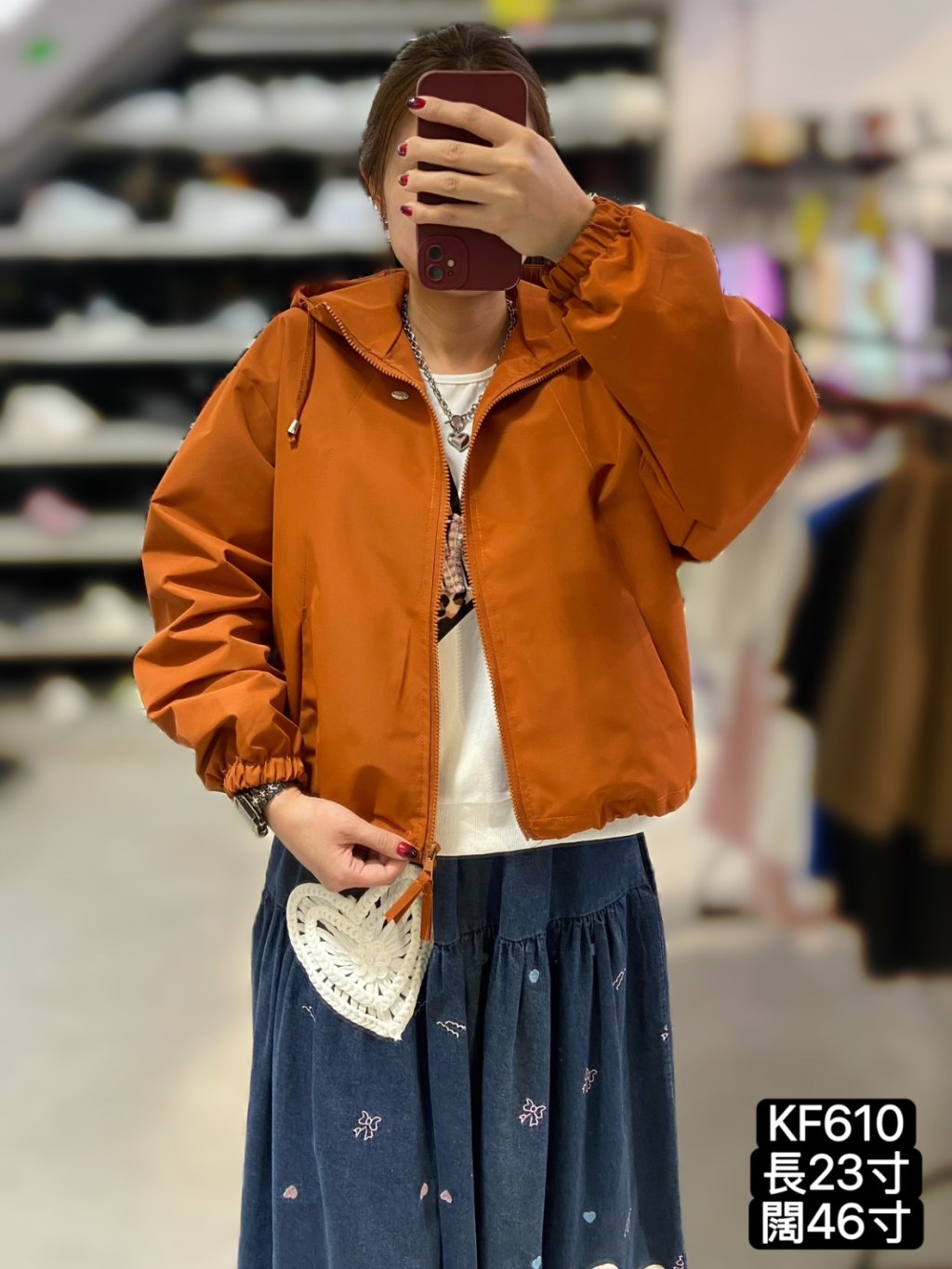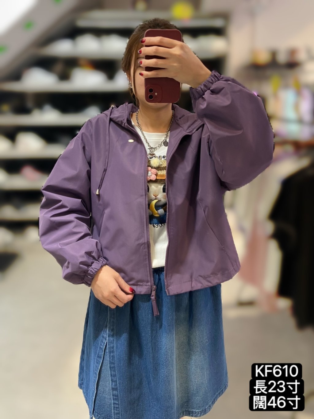 KF610 純色拉鍊有帽薄風褸 $199 長23寸 闊46寸 米白、紫、橙啡、黑