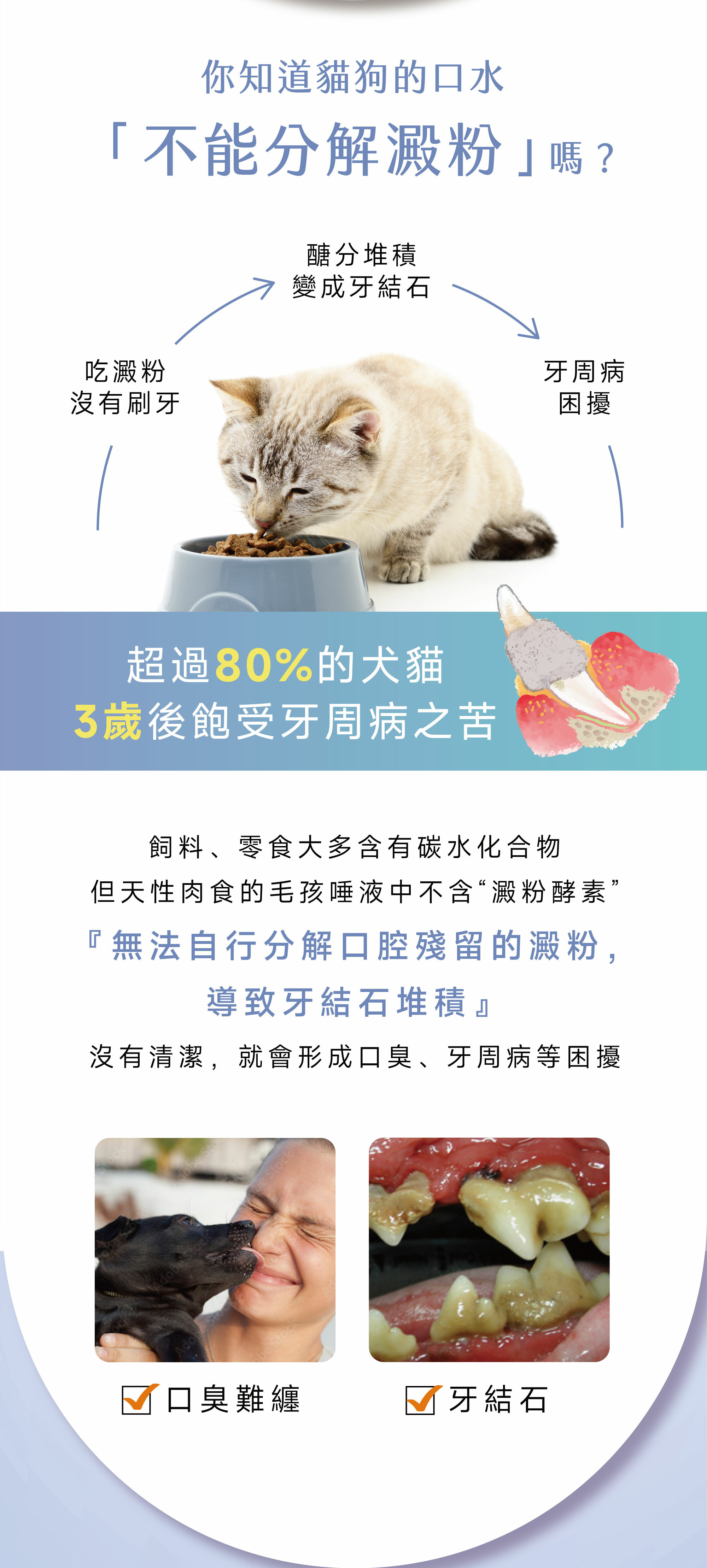 根據統計約有70-80%的狗貓在三歲後便飽受牙周病之苦,