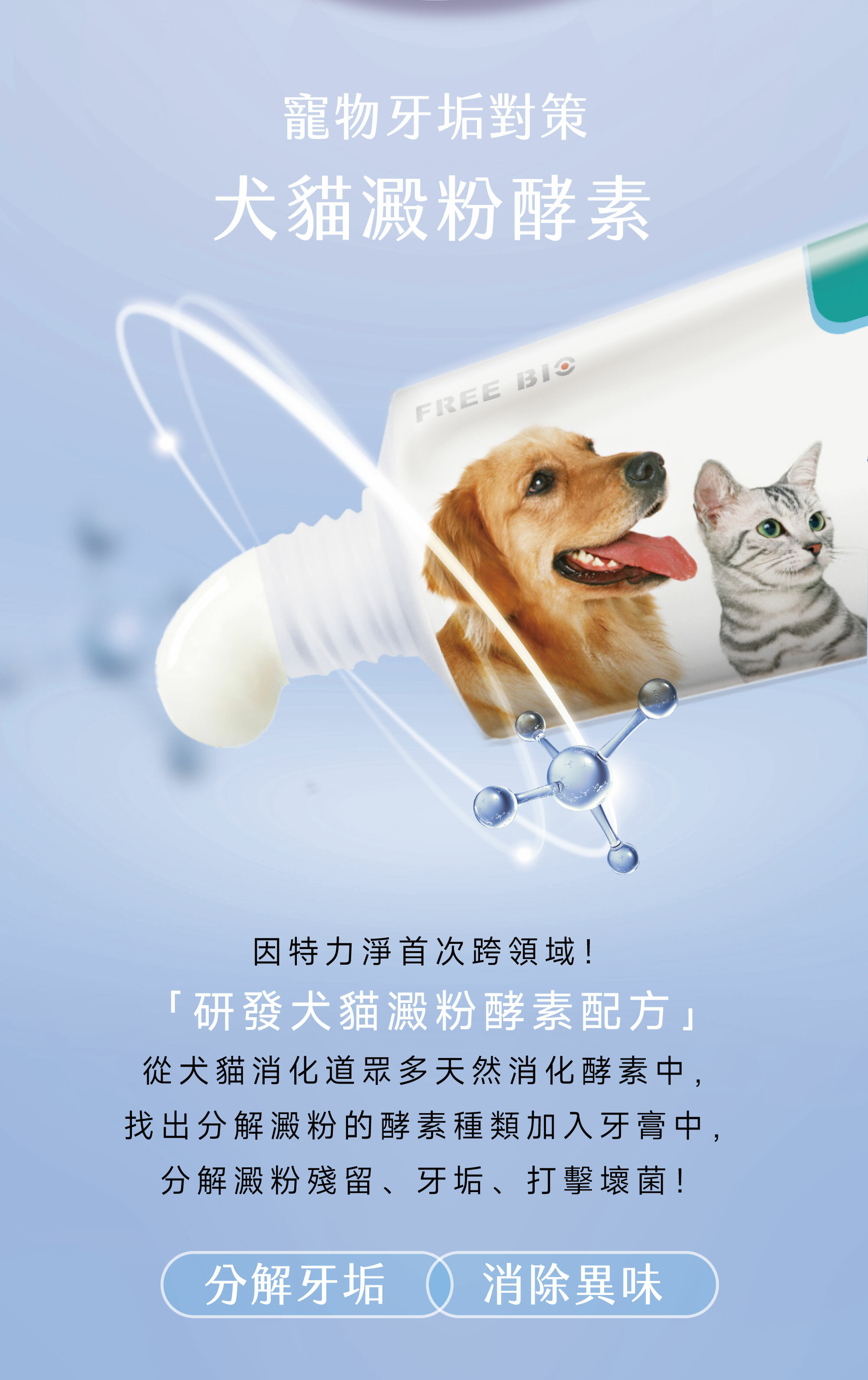 產品特點:內含寵物唾液中所需的天然分解酵素,可與唾液結合作用,打擊口腔壞菌全面清潔口腔,