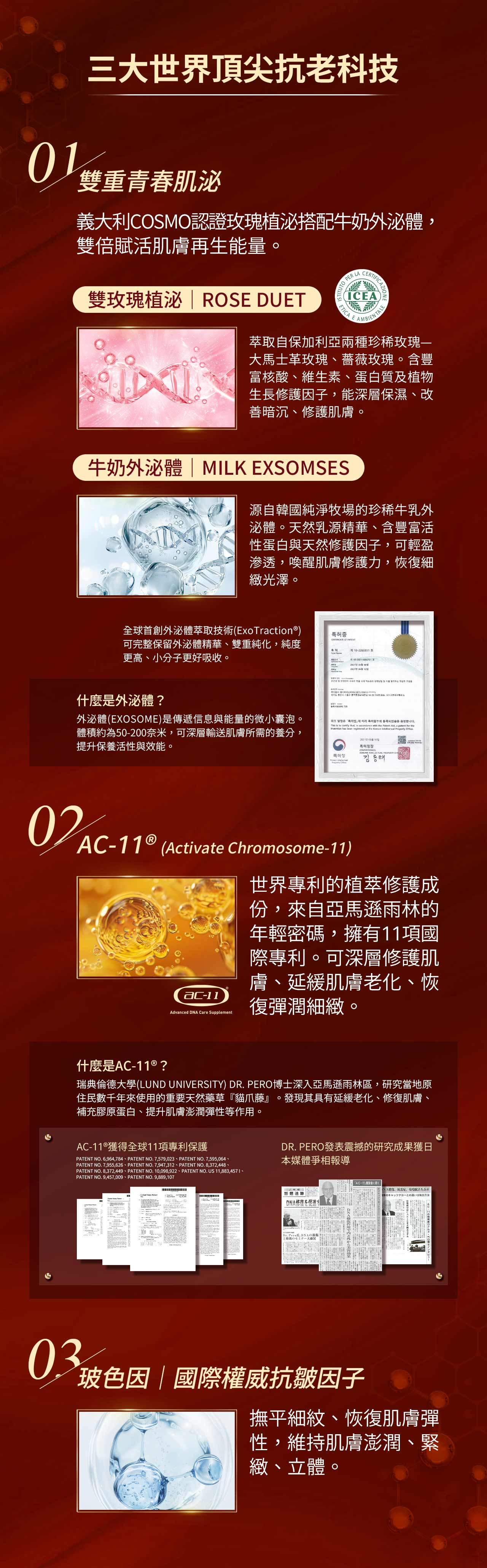 • 全新 AC-11®玫瑰外泌體再生修護系列,結合三大世界頂尖抗老科技: