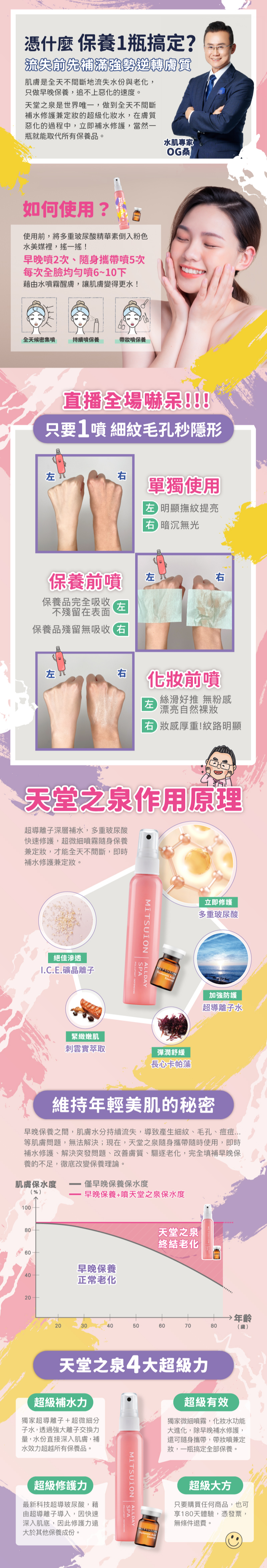 天堂之泉是世界唯一,做到全天不間斷補水修護兼定妝的超級化妝水,